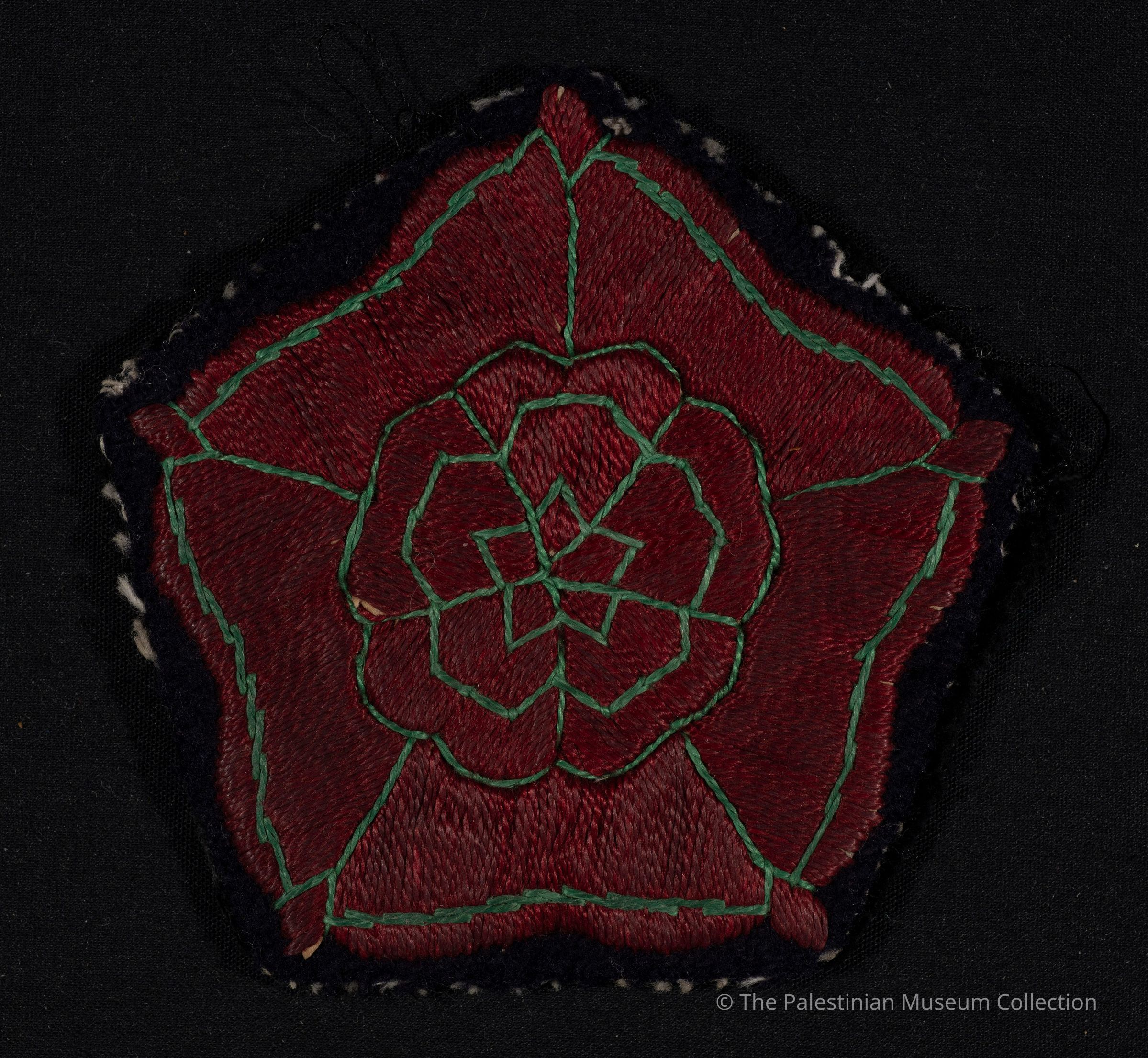 رقعة ملابس على شكل وردة، مصنوعة من قماش الكتان الاسود، ومطرزة باللونين الاحمر والاخضر.