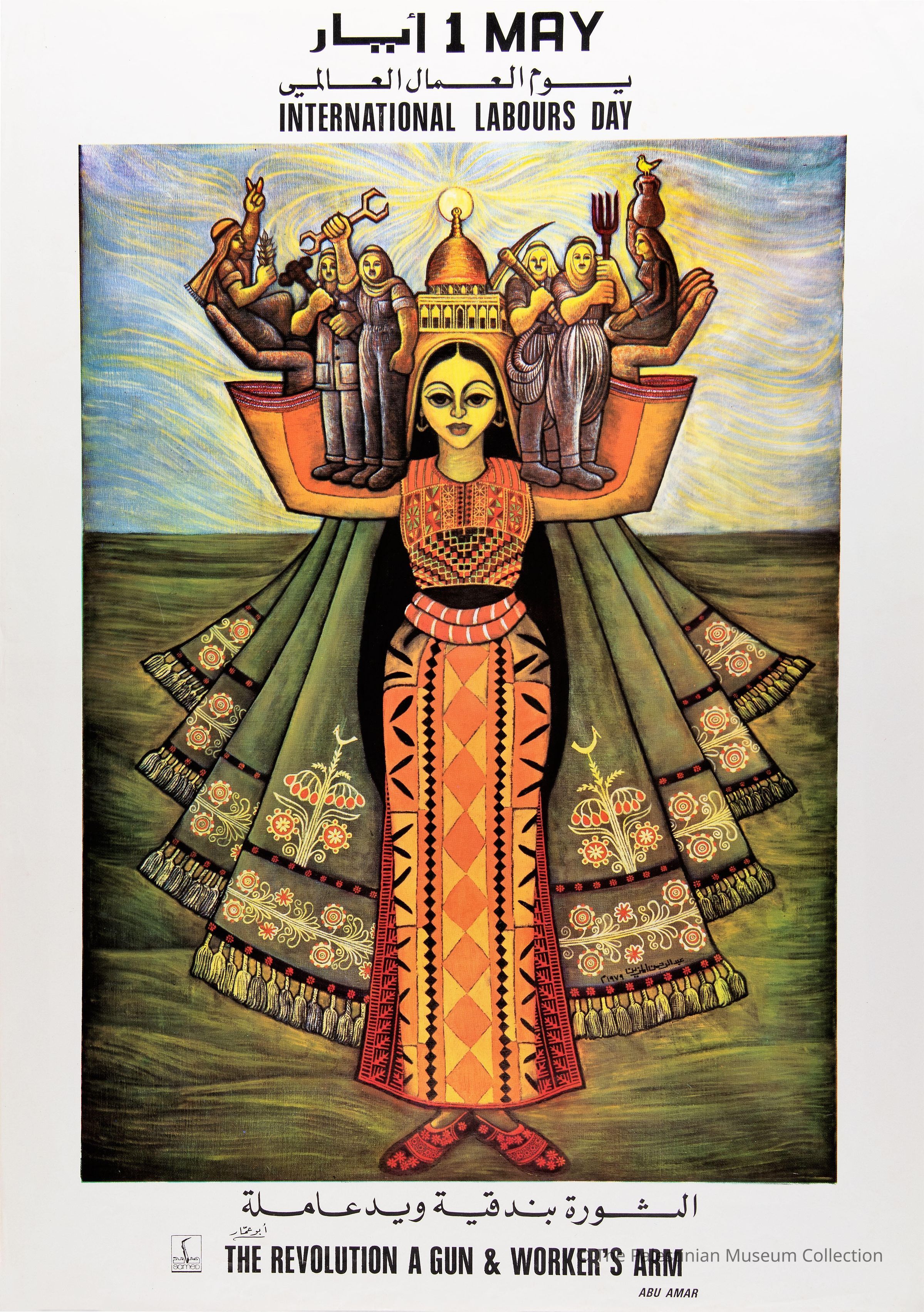 مُلصق بعنوان "الثورة بندقيّة ويد عاملة"، صادر عن جمعيّة أعمال شهداء فلسطين "صامد" عام 1979، بمناسبة يوم العمّال العالمي. تتوفّر ضمن مجموعة المتحف نسخة أخرى من هذا المُلصق.