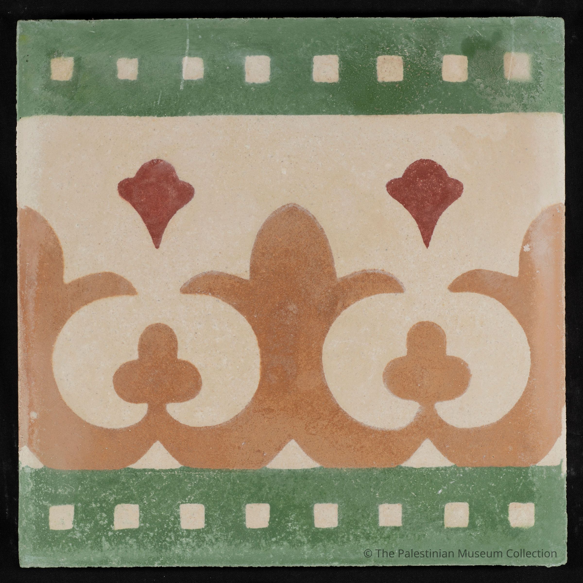 A 20 × 20 cm coloured cement tile featuring the "King Talal's Palace Zunnar (Border)" design. This tile is a contemporary reproduction, cast using an original mold from the Aslan Tile Factory in Nablus, which dates back to the 1930s.Made/Created