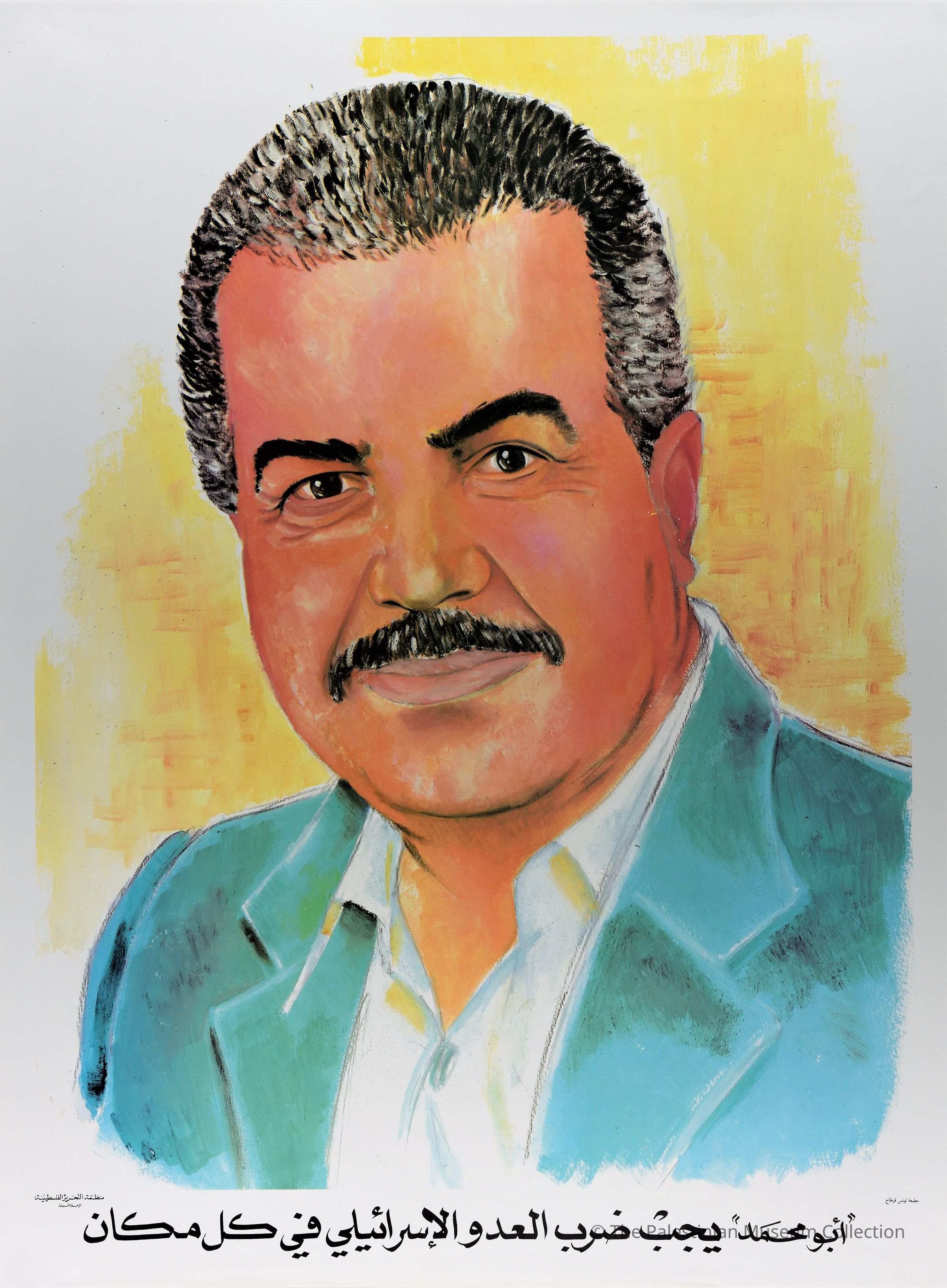 ملصق ملون، عبارة عن رسم للشهيد أبو محمد. توقيع الفنان غير موجود، ولكن لتشابه اسلوب الرسم مع لوحات اخرى تم نسبة هذه اللوحة له.