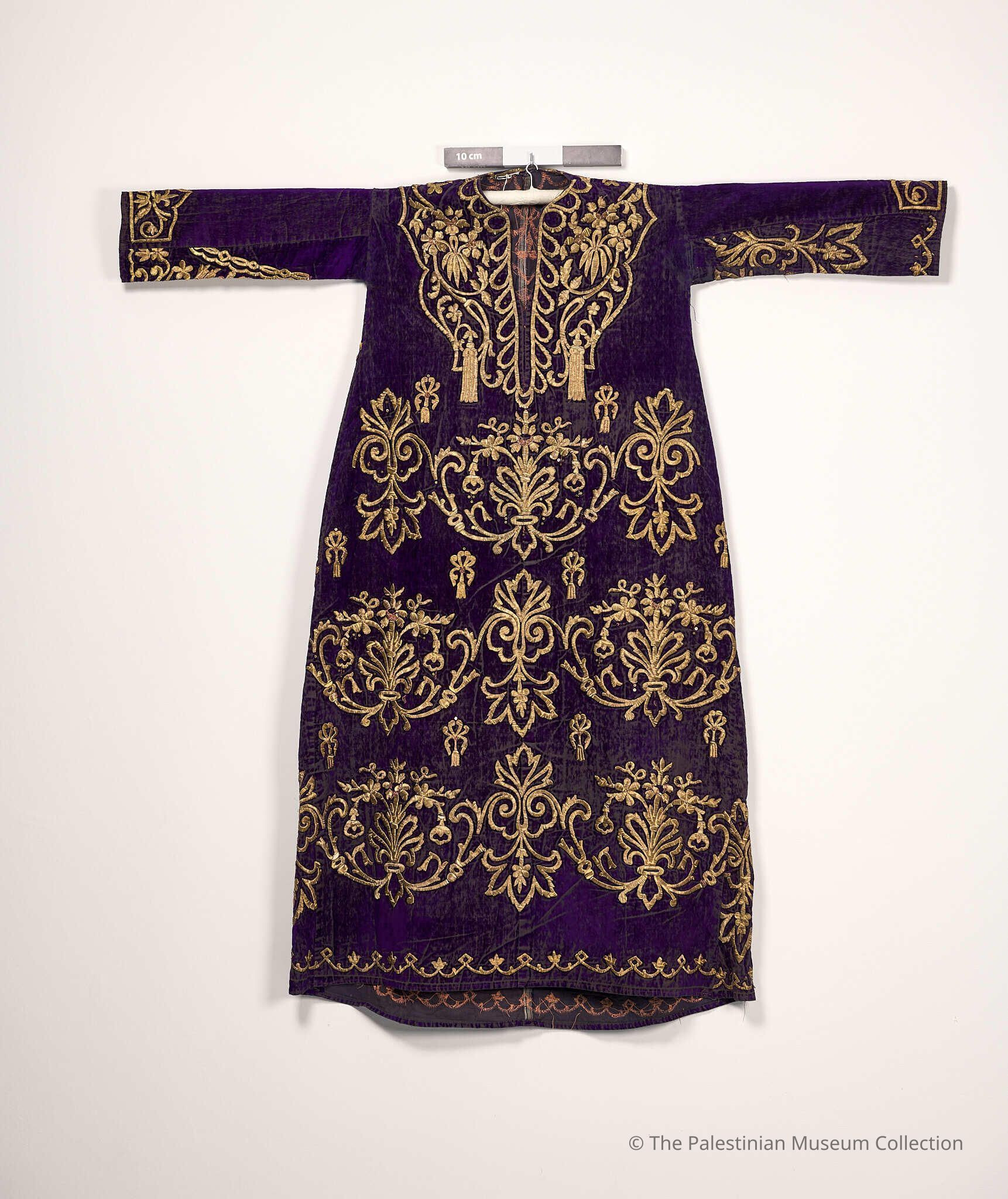 Sarma thobe (dress) from Jerusalem (influenced by a Turkish style called Sarma). It is made of purple velvet and embroidered with gilded qasab (metallic couching cord) with a Tara stitch. Chest panel, shoulders, and back panel (the upper back neckline) are embroidered with plant shapes. As for the sleeves, they are embroidered with gilded qasab in plant shapes. The front and back panel of the thobe along with the sides (al-Banayiq) are heavily embroidered with a variety of plant and geometric shapes made of gilded qasabMade/Created
