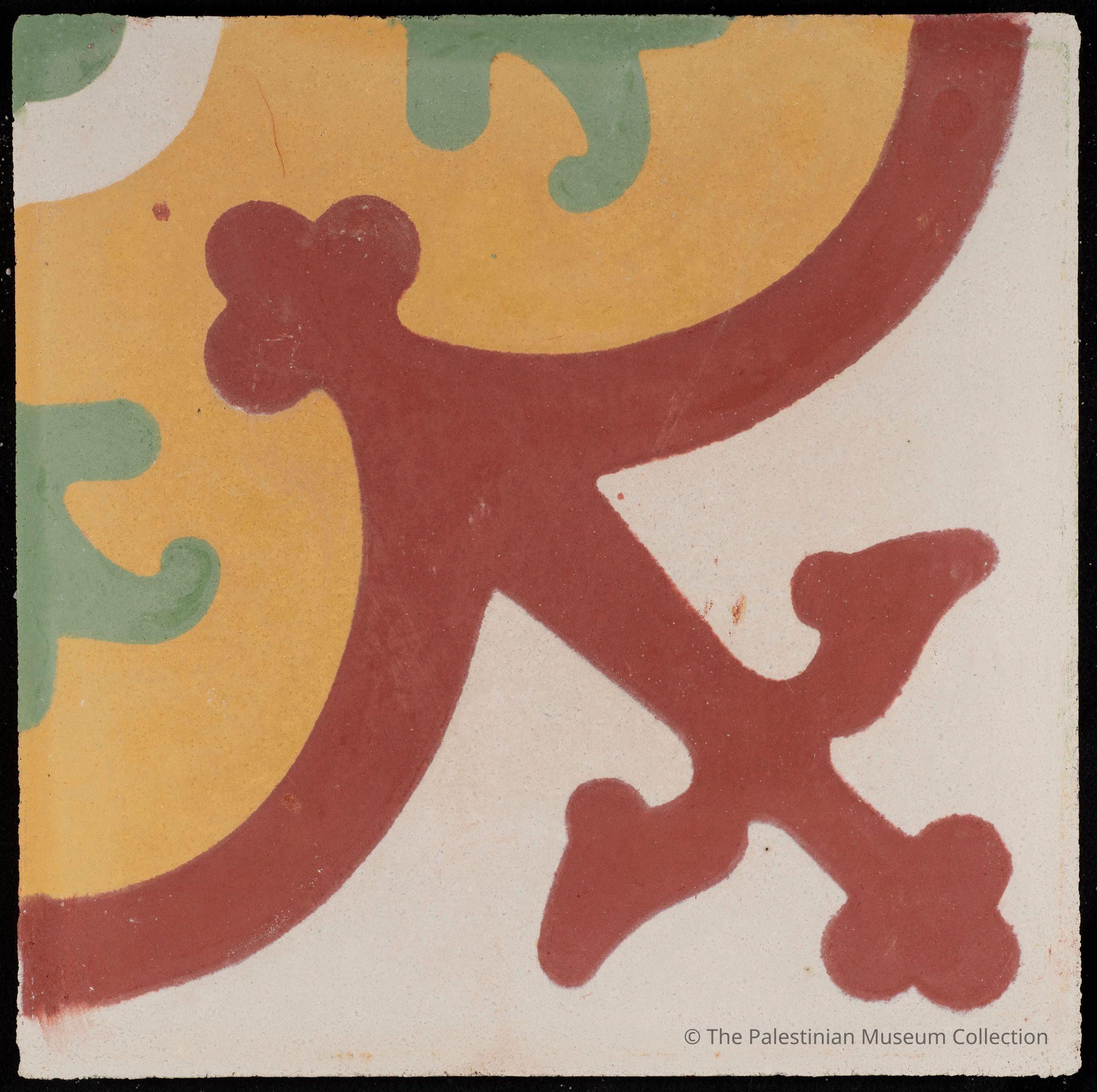 بلاطة إسمنتيّة ملوّنة بحجم 20 × 20 سم، تحمل تصميم "سجّادة البيروتية"، وهي نموذج حديث سُكبت في قالب يمتلكه مصنع أصلان للبلاط في نابلس يعود إلى ثلاثينيات القرن العشرين.