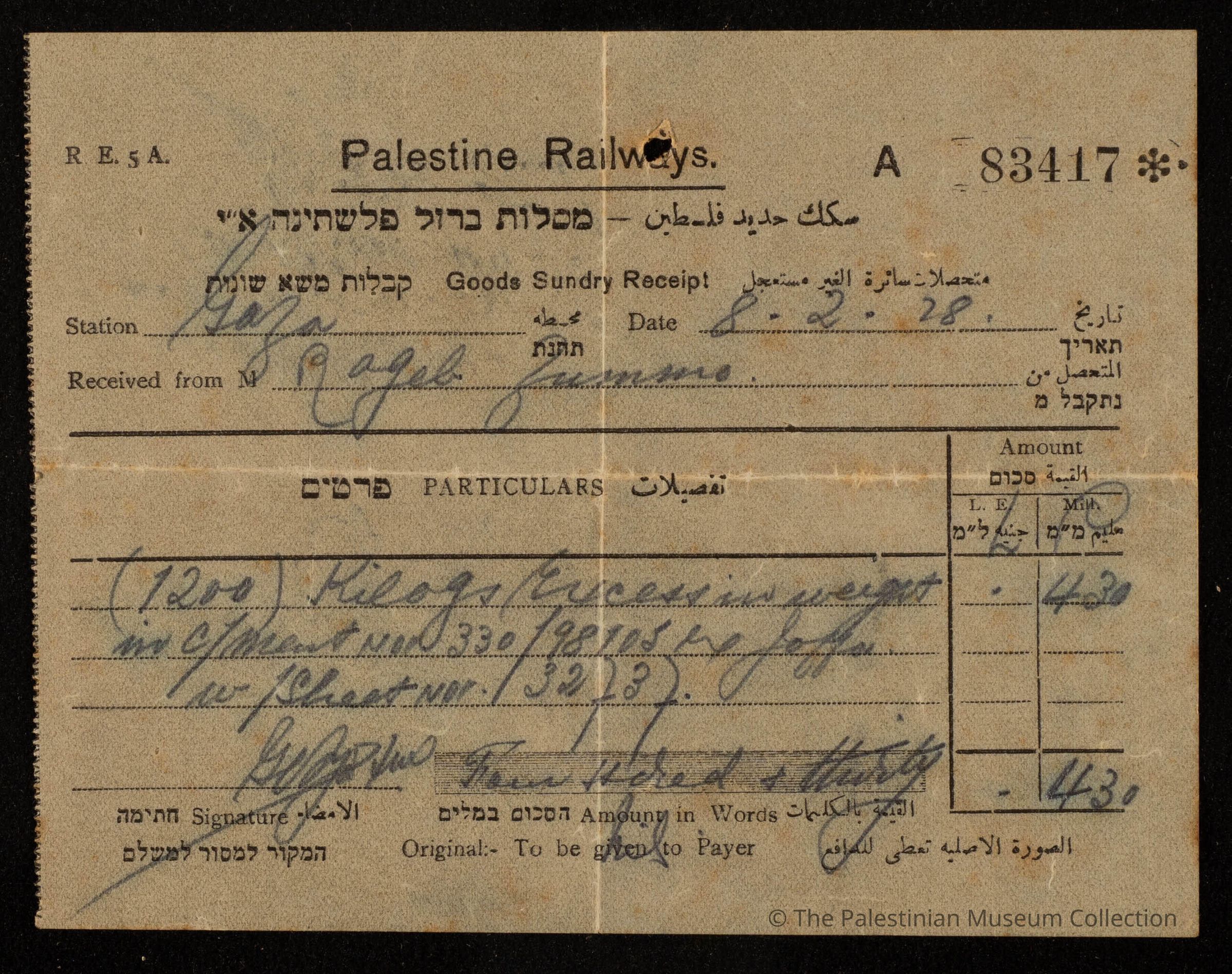 معلومات إيصال بضائع متنوعة صادرة عن سكك حديد فلسطين. Goods Sundry Receipt, issued by the Palestinian Railways.