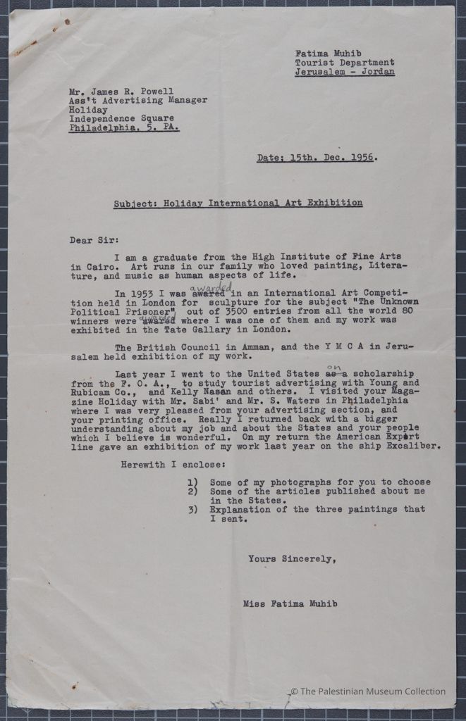 An official document written in English and issued by Fatima Muhib and addressed to Holiday Magazine in Philadelphia, regarding her participation in the Holiday International Art Exhibition.