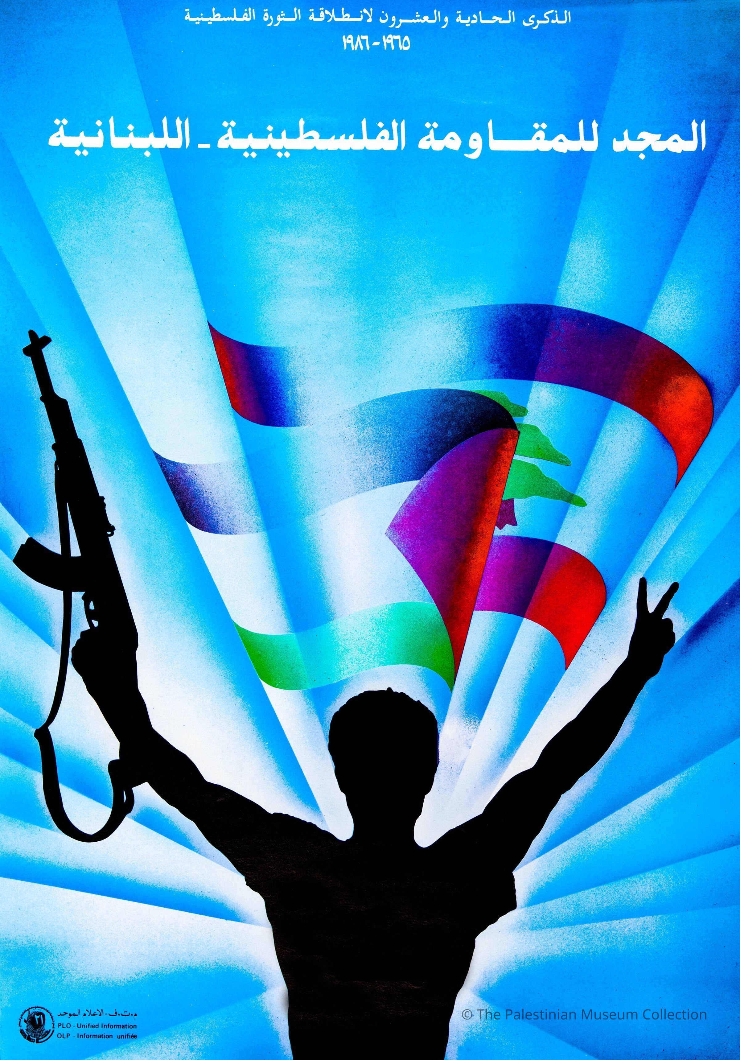 مُلصق بعنوان "المجد للمقاومة الفلسطينيّة - اللّبنانيّة"، صادر عن مجلس الإعلام الموحّد لمنظّمة التحرير الفلسطينيّة عام 1986، بمناسبة الذكرى الحادية والعشرين لانطلاقة حركة التحرير الوطني الفلسطيني (فتح).