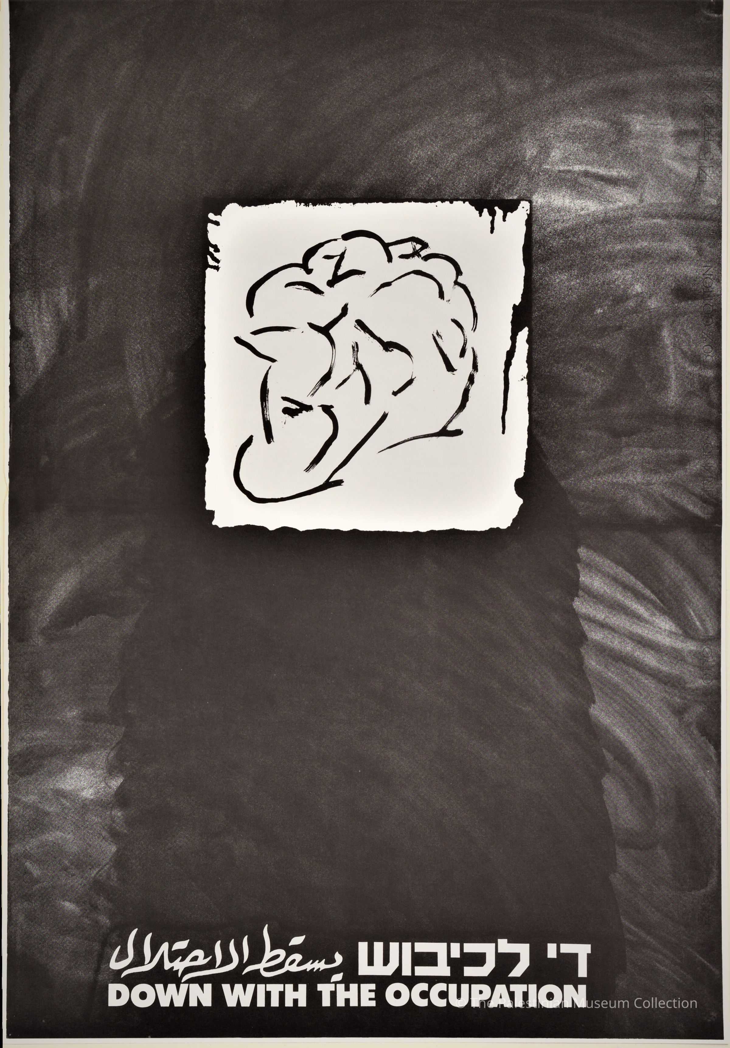 This poster by the artist Larry Abramson was part of the 'Down with the Occupation' exhibition held in 1987 by the Association of Artists for Freedom of Expression in the El-Hakawati Theatre in Jerusalem to mark 20 years since the 1967 occupation of the West Bank. The exhibition included posters by Palestinian and Israeli artists.Dimensions