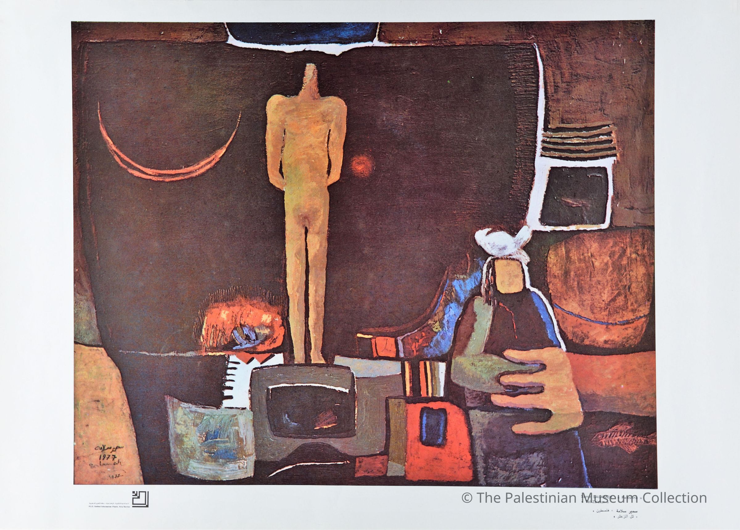 A colour poster showing a naked man standing in front of a flame and looking at the moon. Another man next to him is seen looking at him. The artist painted this painting to represent the situation of Tal-Za'atar Camp during its siegeDimensions