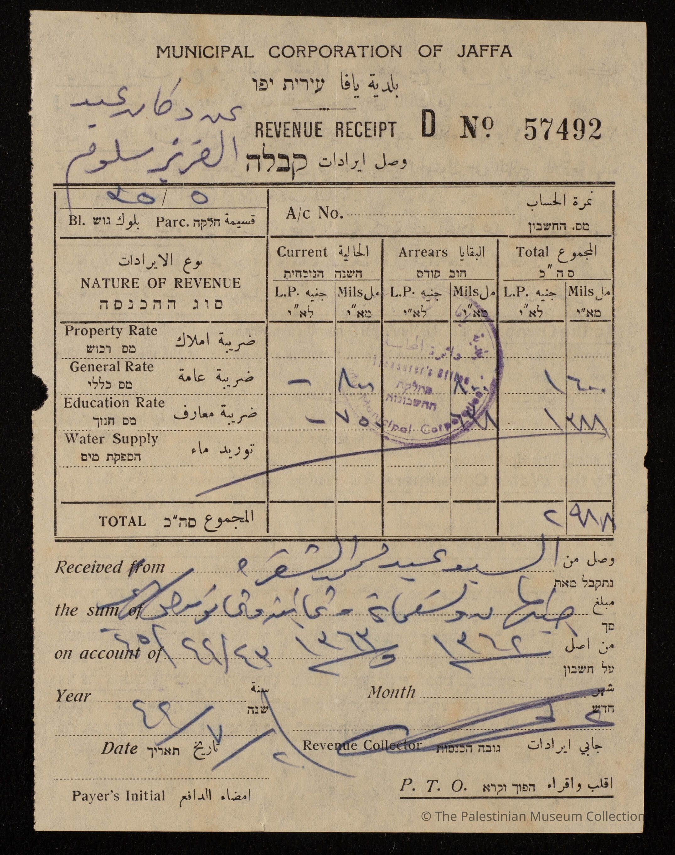 A revenue receipt issued by the Municipal Corporation of Jaffa for Mr. Abdel Aziz Salloum, pertaining to his store.Dimensions