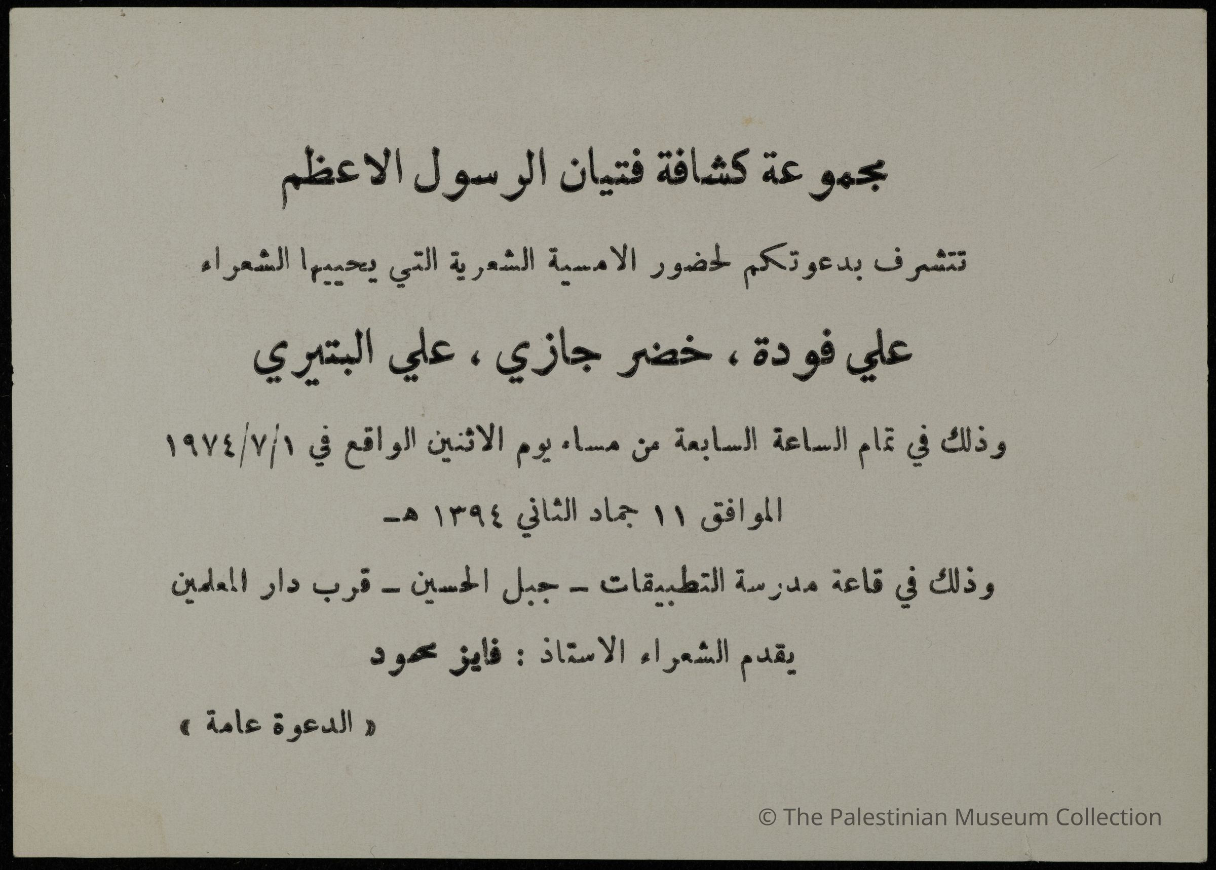 دعوة من كشافة فتيان الرسول الاعظم، تحتوي على دعوة لحضور امسية شعرية يحيها الشعراء علي فودة، خضر جازي، علي البتيري في قاعة التطبيقات