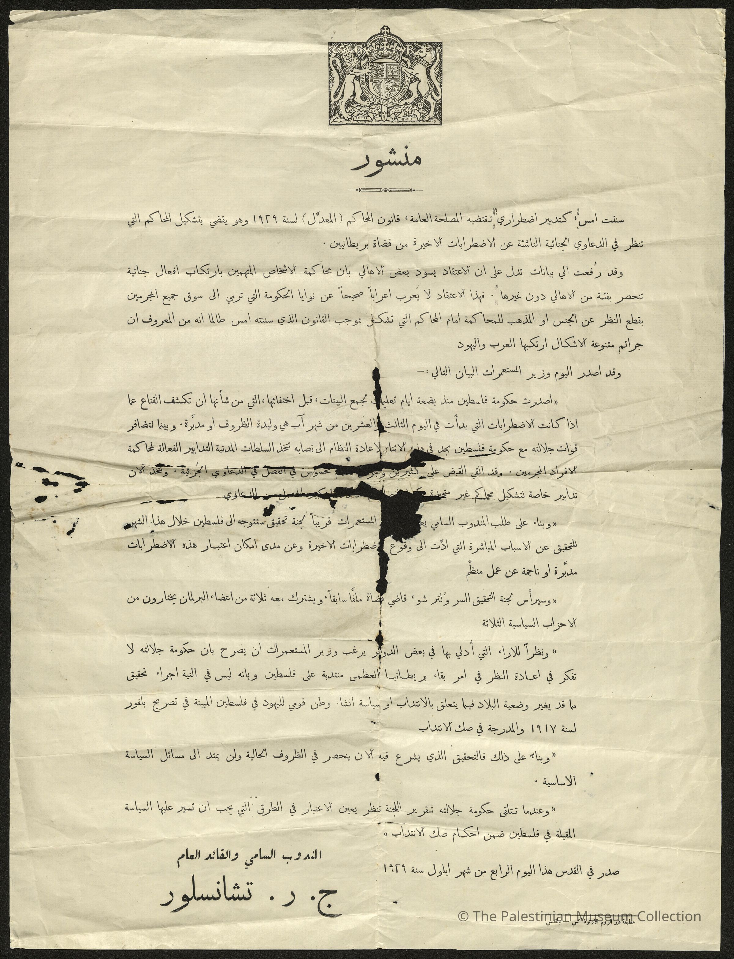 بيان حكومي صادر عام 1929 عن سلطات الانتداب البريطاني بخصوص أحداث ثورة البراق، وتحمل الوثيقة إعلان بسن قانون معدل للمحاكم بغية تشكيل محاكم جنائية خاصة للنظر في الأحداث الجنائية الناتجة عن الاضطرابات الأخيرة.