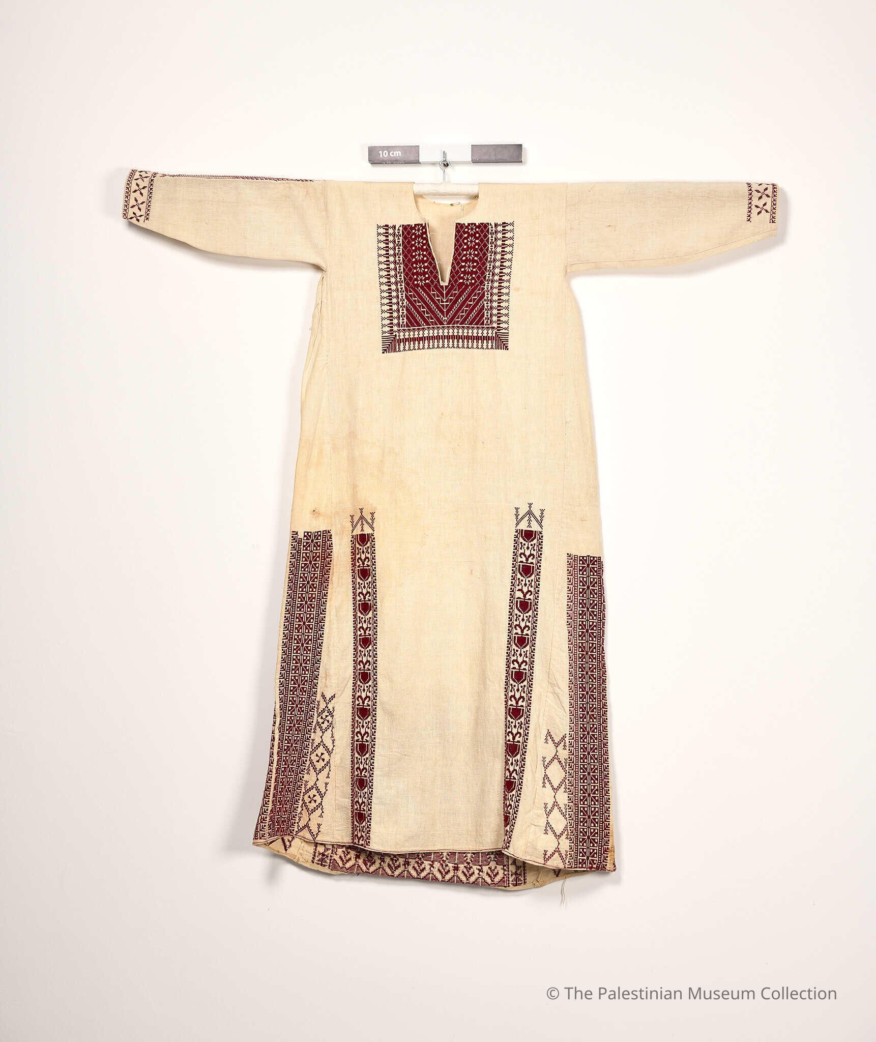 A thobe (dress) from the area of Ramla. It is made of beige linen and cotton and embroidered with red silk threads. The chest panel of the thobe is embroidered with feather motifs and geometric shapes with a Fallahi (peasant) cross stitch. As for the shoulders and the back of the chest panel (the upper back neckline), there is no embroidery. The sleeves are embroidered with a thin stitch pattern, while the cuffs are embroidered with a fan motif. The front panel of the thobe from the bottom of the waist have mid-density tatreez (embroidery) of two parallel stitch patterns of plant shapes and pot and a mountains motif, whereas the back panel is embroidered with two parallel light stitch patterns of plant shapes and a feather motif with a heavy tatreez of mountains, cypress, and feather motifs and various plant shapes in the centre. The sides (al-Banayiq) are embroidered with a duplicated twice thick stitch patterns of feather motif and plant shapes.Made/Created