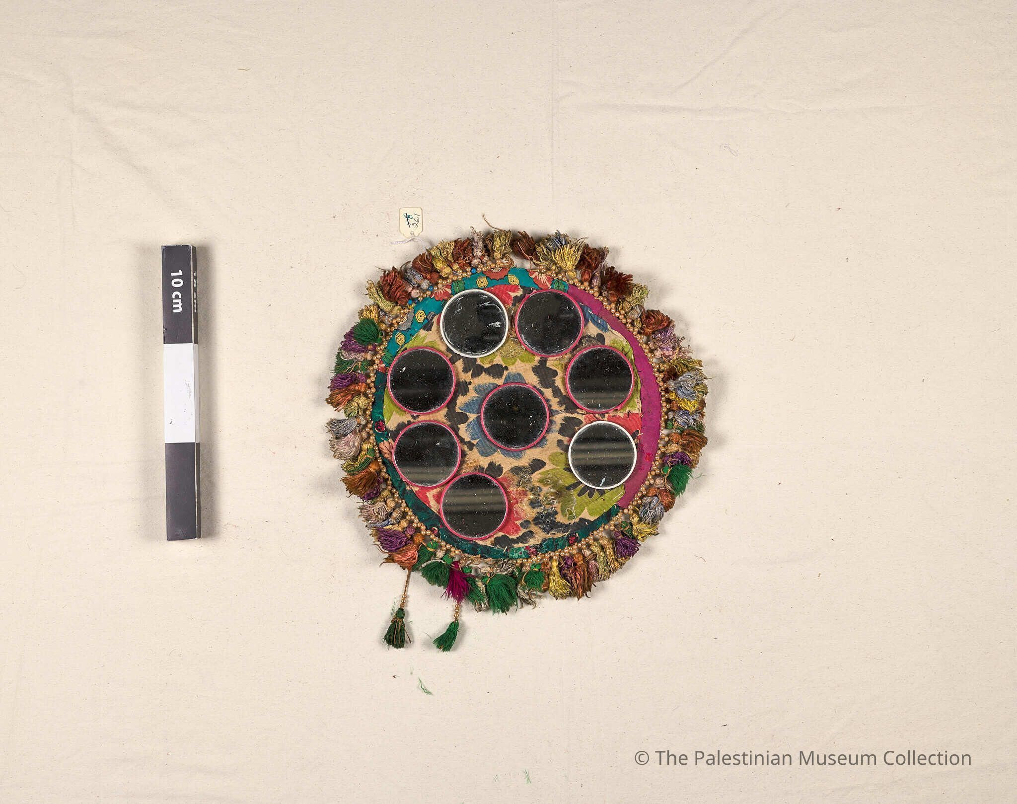A straw plate made from hand-woven wheat straw, covered with colourful cotton fabric and adorned with several round mirrors. It has silk fringes decorated with colourful beads hanging from it.Made/Created