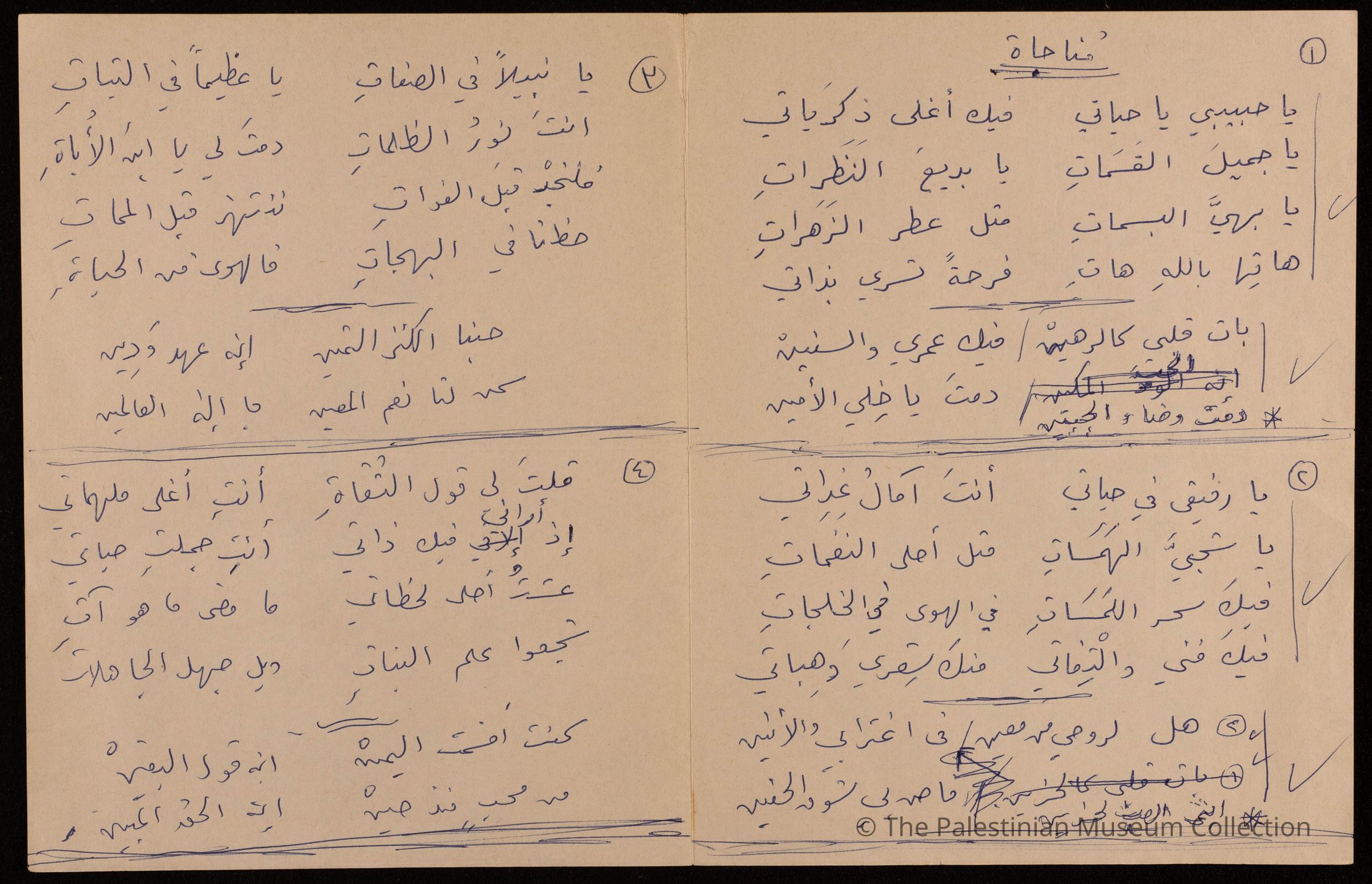 مخطوطة قصيدة باللغة العربية بعنوان " مناجاة" للشاعرة فاطمة المحب، ولا تحمل الوثيقة اية اشارة الى تاريخ كابتها