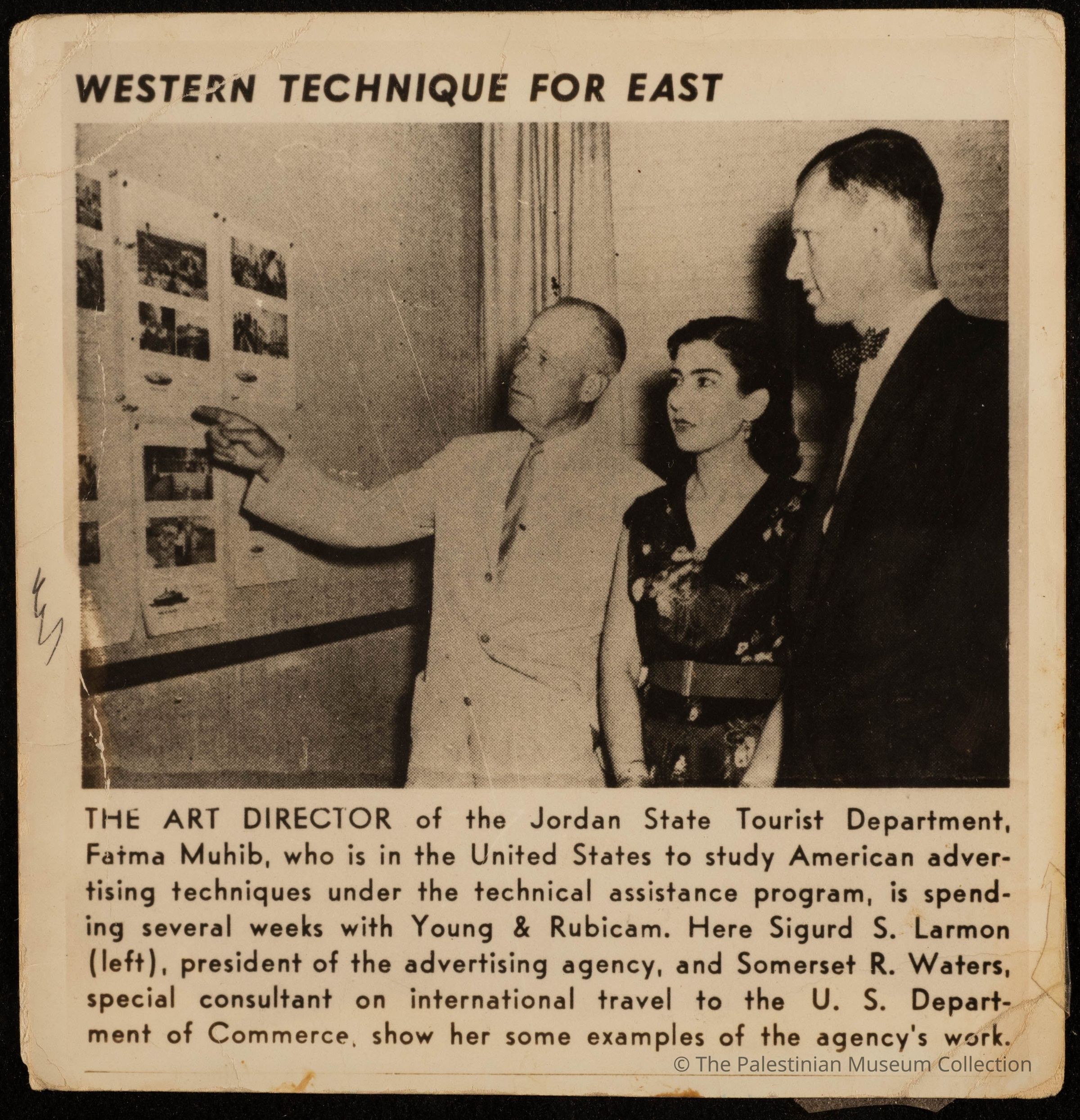 صورة فاطمة المحب برفقة سغارد لارمون مدير وكالة التسويق، وسومارست واترز المستشار الخاص بالتنقل حول العالم في وزارة الاقتصاد الأمريكية، التُقطت في أمريكا أثناء دراسة فاطمة لتقنيات الدعاية السياحية، إذ كانت مديرة القسم الفني في الدائرة السياحية في الدولة الأردنية حينها.