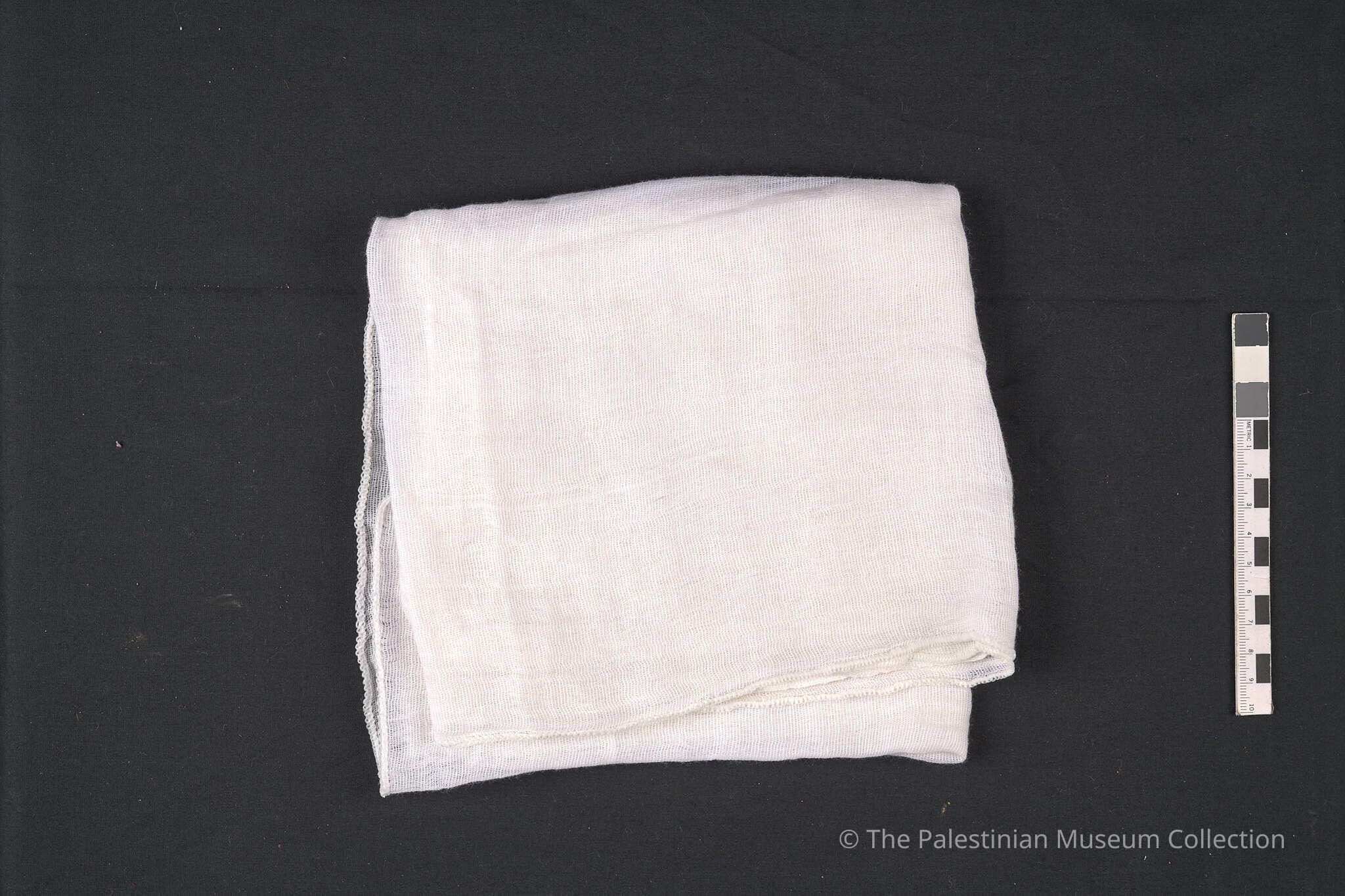 A white cotton shawl (cloth) from Bethlehem which would be worn on the head and is hand-stitched at all its edges.Made/Created