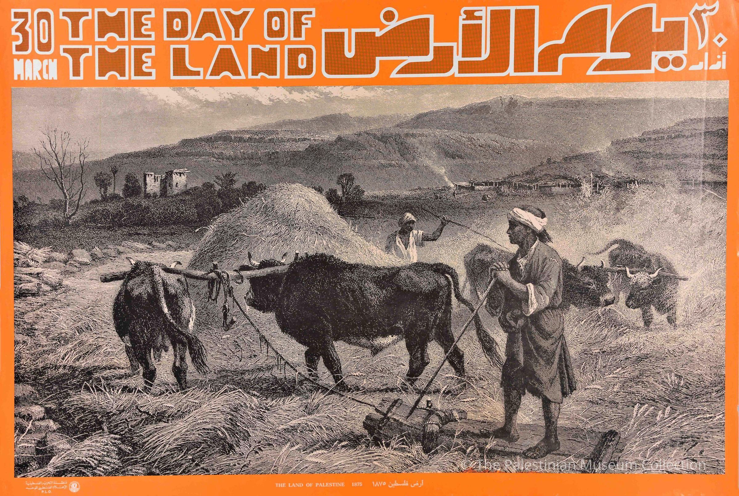 مُلصق بعنوان "30 آذار، يوم الأرض"، صادر عن مجلس الإعلام الموحّد لمنظّمة التحرير الفلسطينيّة في ذكرى يوم الأرض عام 1983، من تصميم الفنّان إسماعيل شمّوط، والذي استند فيه إلى رسم للفنّان ديفيد روبرتس يعود إلى العام 1875، بعنوان "أرض فلسطين 1875"، وهو واحد من سلسلة مُلصقات أُنتجت احتفاء بهذه المناسبة.