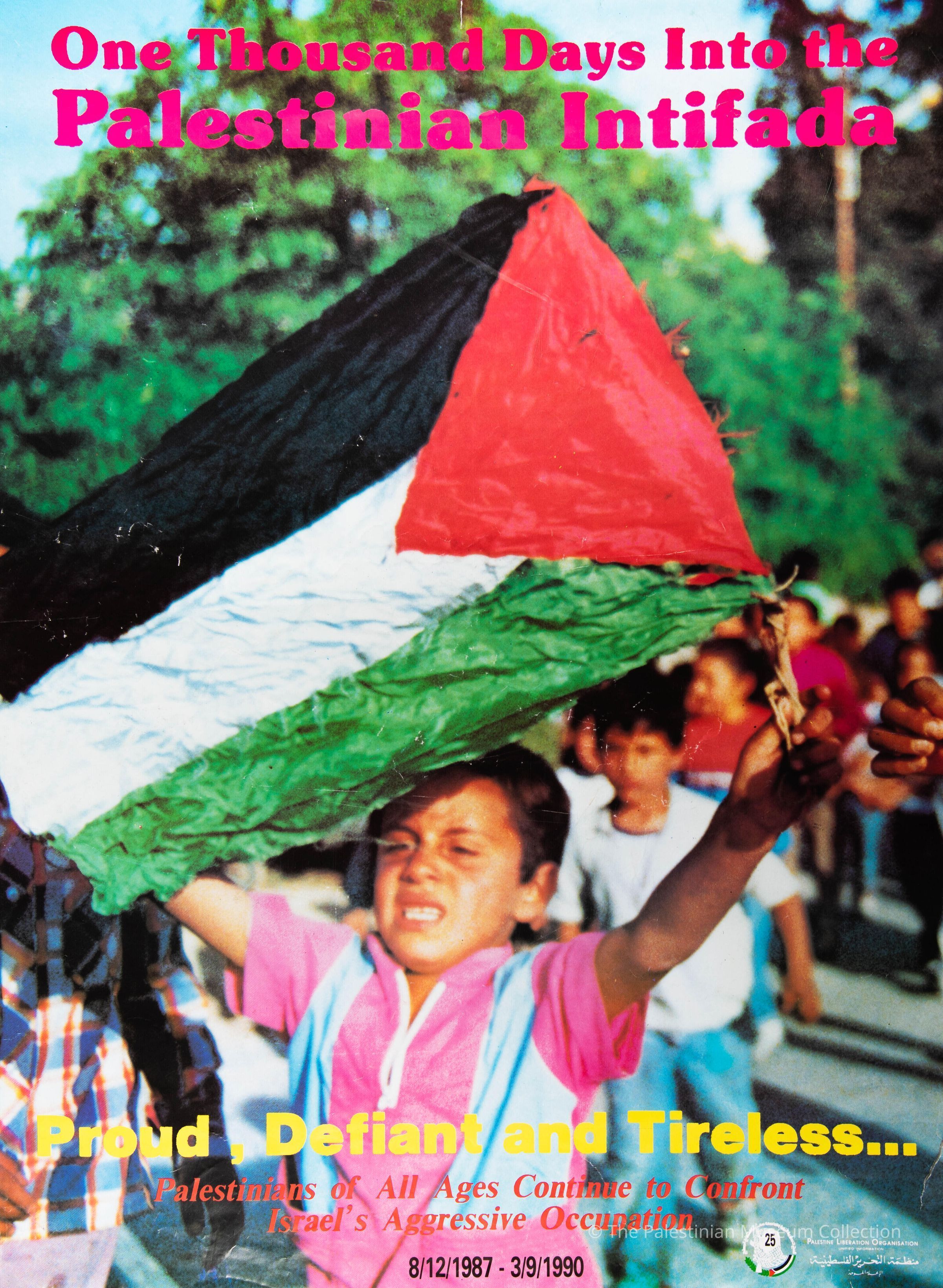 A poster entitled 'One Thousand Days Into the Palestinian Intifada' issued by the Unified Information Office of the Palestine Liberation Organisation (PLO) in 1990 marking 1000 days of the Palestinian people's First Intifada. The Museum collection has one duplicate available of this poster.Dimensions