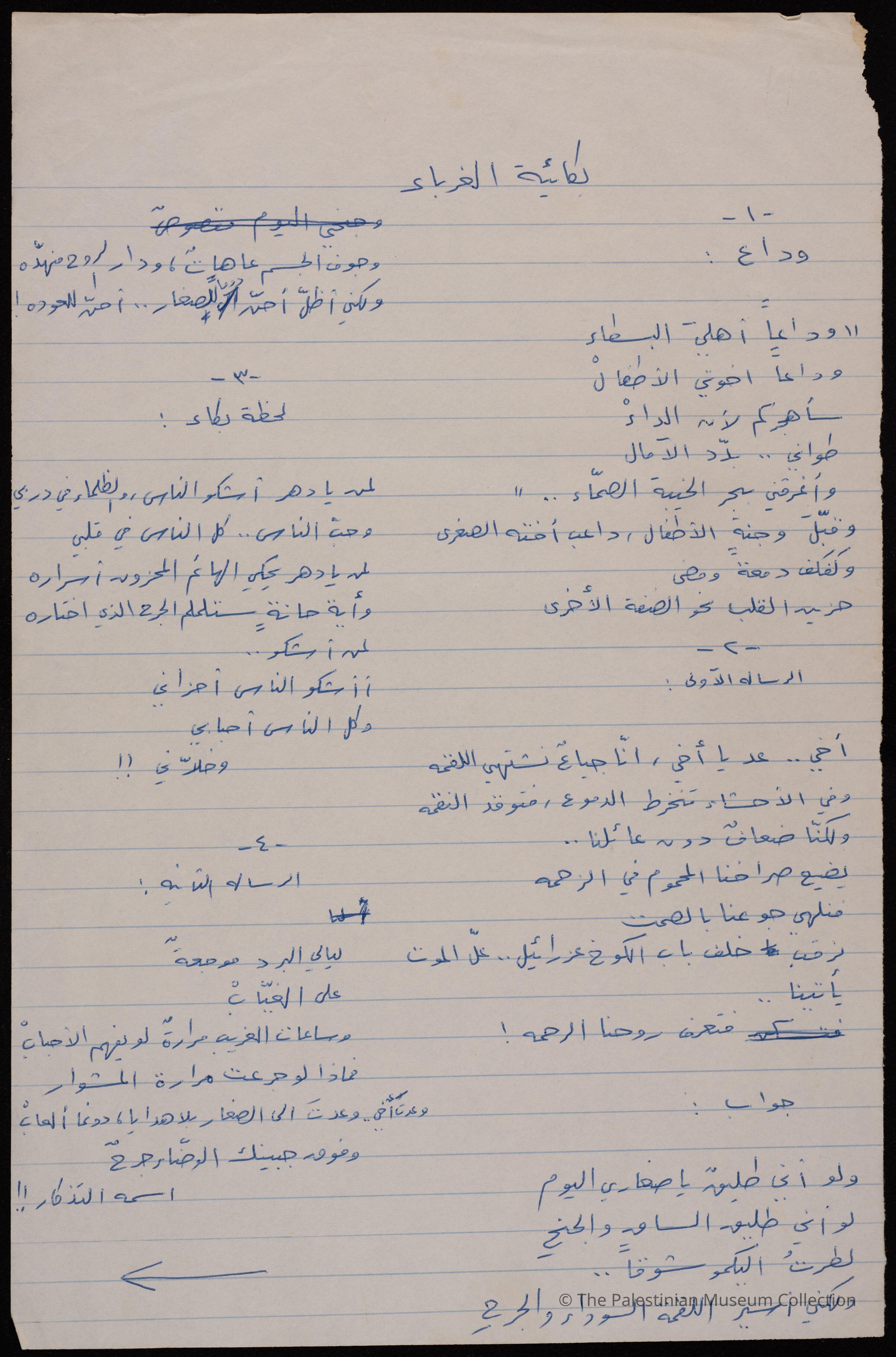 قصيدة بكائية الغرباء، تحتوي على صفحتين من مقاطع النثر يودع فيها أهله، كتبت بخط يد الشاعر علي فودة.