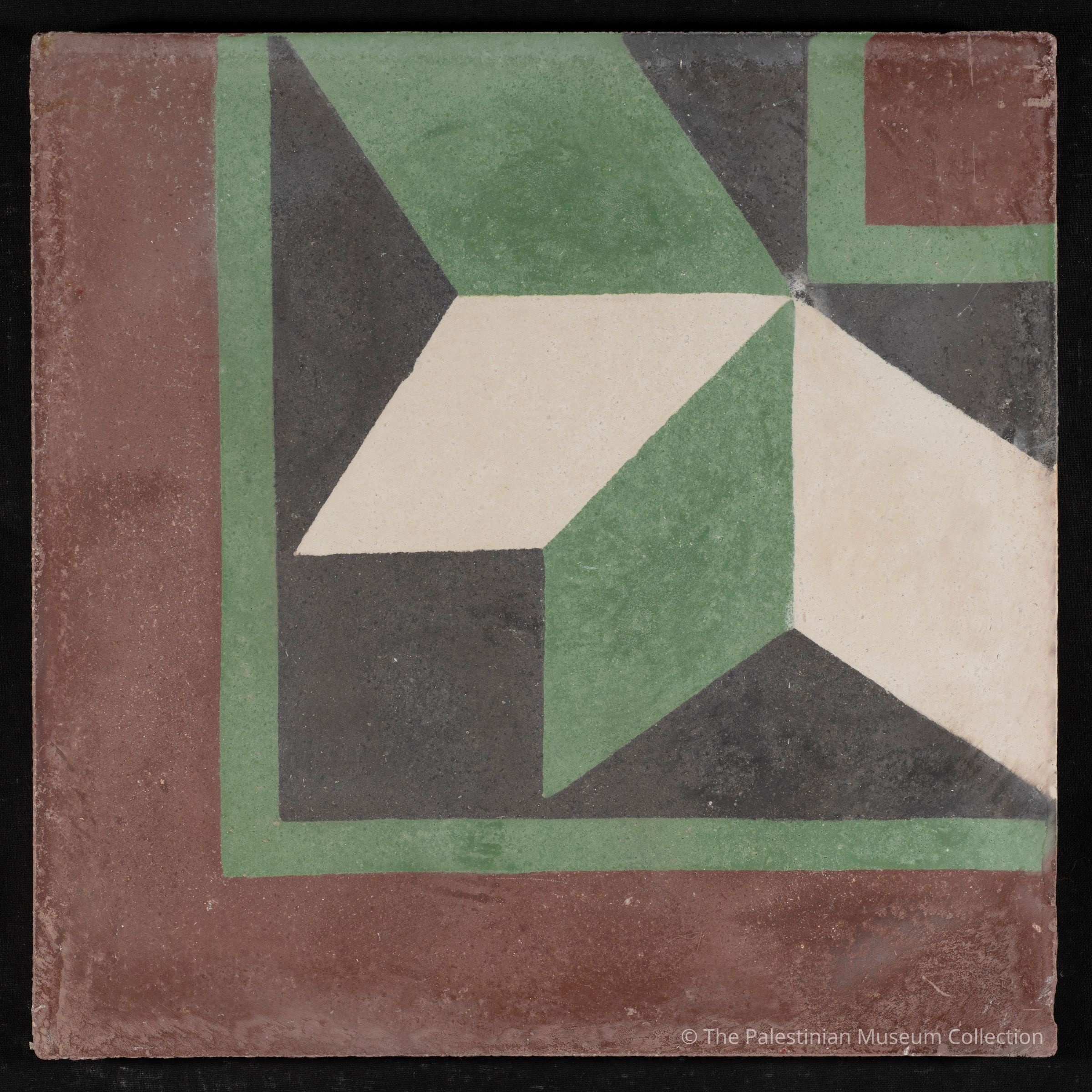 بلاطة إسمنتيّة ملوّنة بحجم 20 × 20 سم، تحمل تصميم "زاوية زنار البقلاوة"، وهي نموذج حديث سُكبت في قالب يمتلكه مصنع أصلان للبلاط في نابلس يعود إلى عشرينيات القرن العشرين.