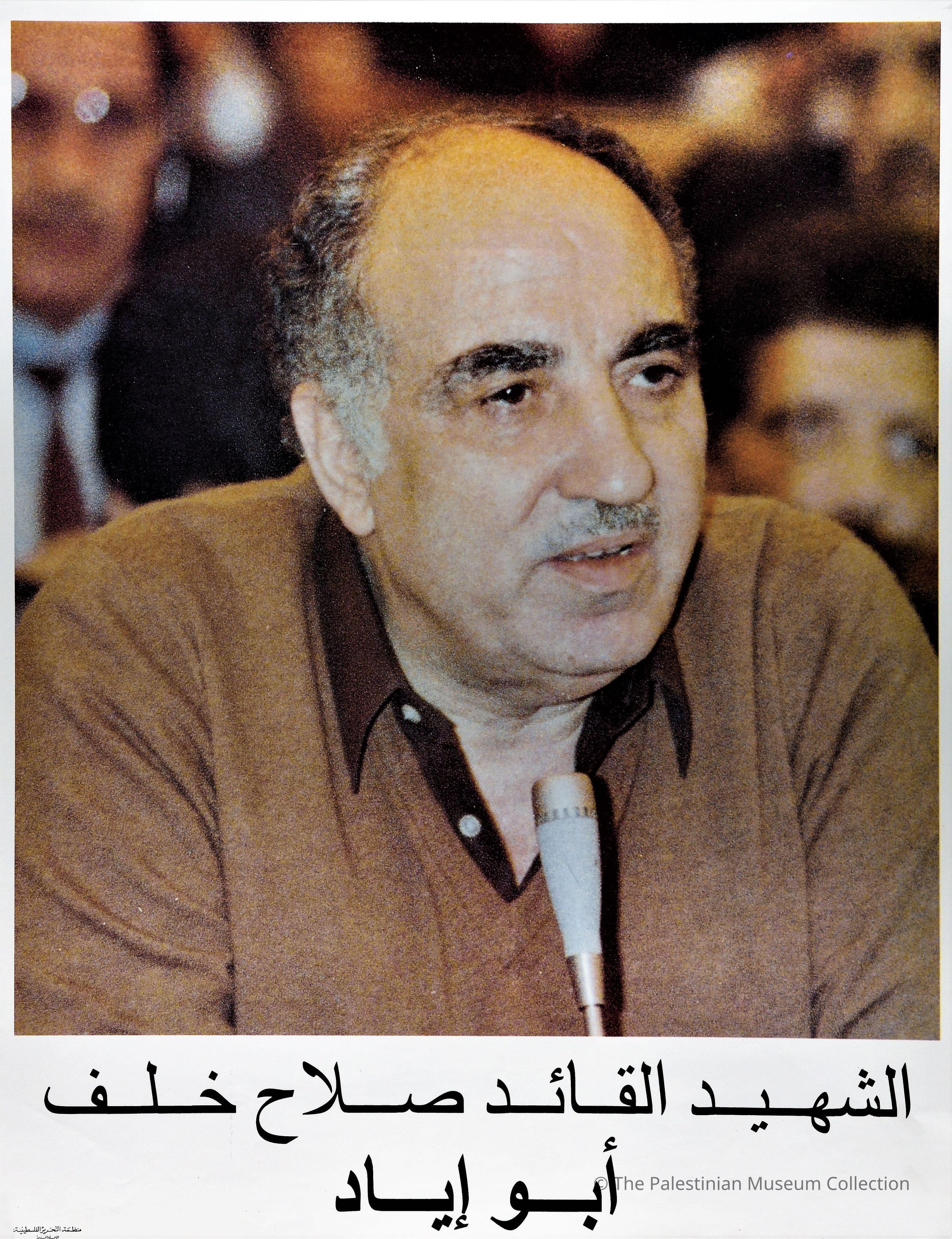 ملصق ملون صادر عن منظمة التحرير الفلسطينية، يتضن صورة الشهيد صلاح خلف "أبو إياد" (1933-1991) خلال إلقاء أحد الكلمات، وقد حمل عبارة "الشهيد القائد صلاح خلف أبو إياد".
