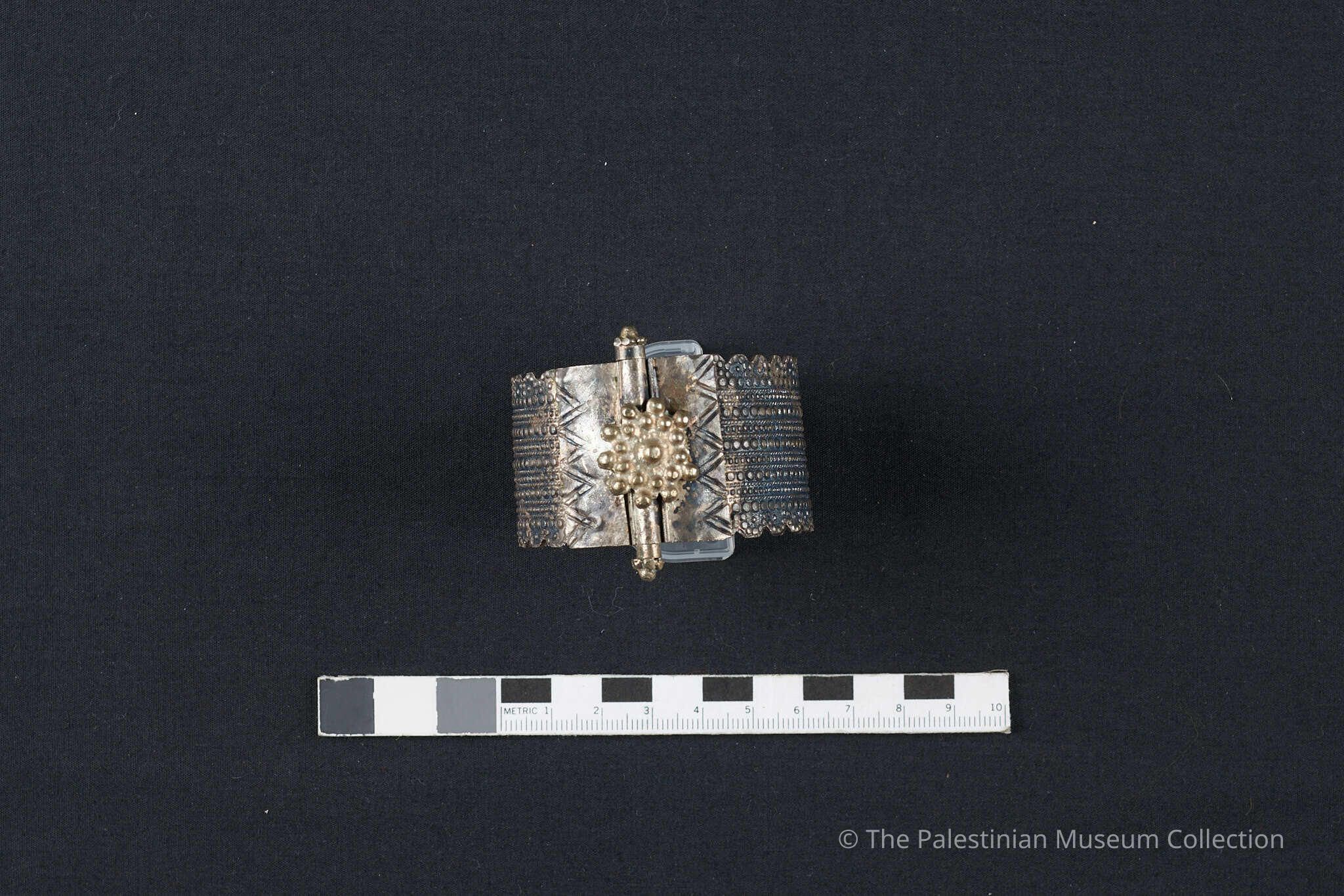 A broad bracelet adorned with silver spheres, with a large flower-shaped claspMade/Created