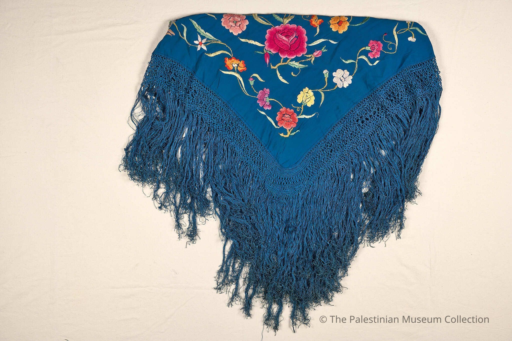 Japanese shawl made of blue cotton and linen with a square shape, though worn in a triangle shape. It has roses embroidered using Tahriri stitches (couching) using pink, white, yellow, and orange silk threads and is fringed on all endsMade/Created