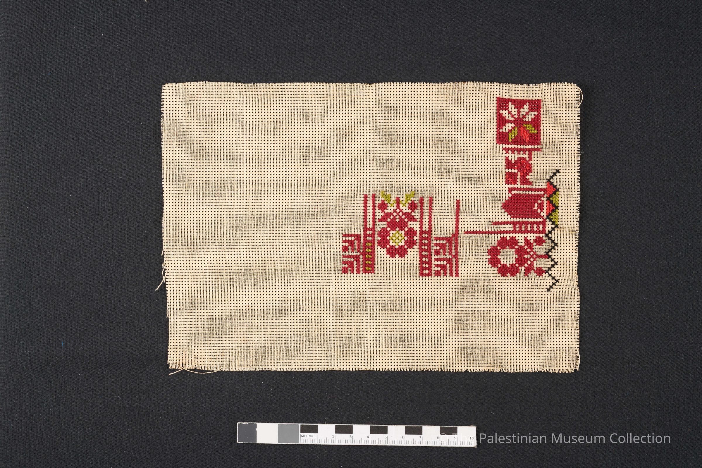 نموذج تطريز على قماش ايتامين بحرير لون احمر واخضر واسود برسمات متعددة منها نجمة بيت لحم والريش والورد