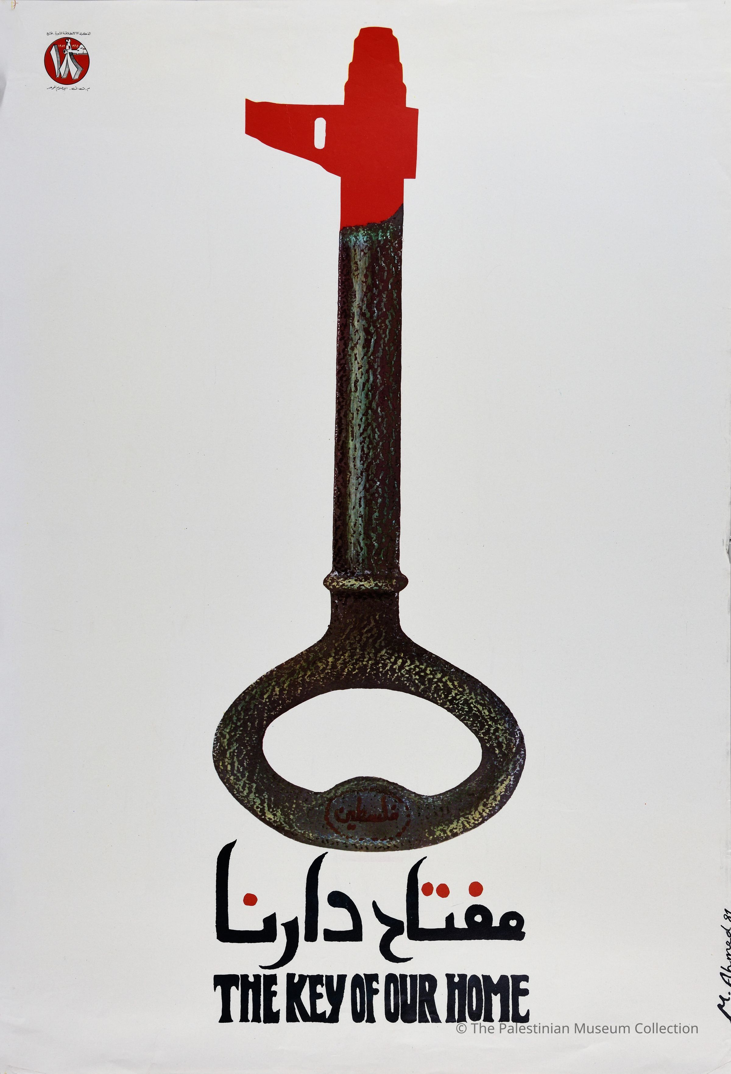 A colour poster of a key to an old house; its pointy end is shaped like a rifle.Dimensions