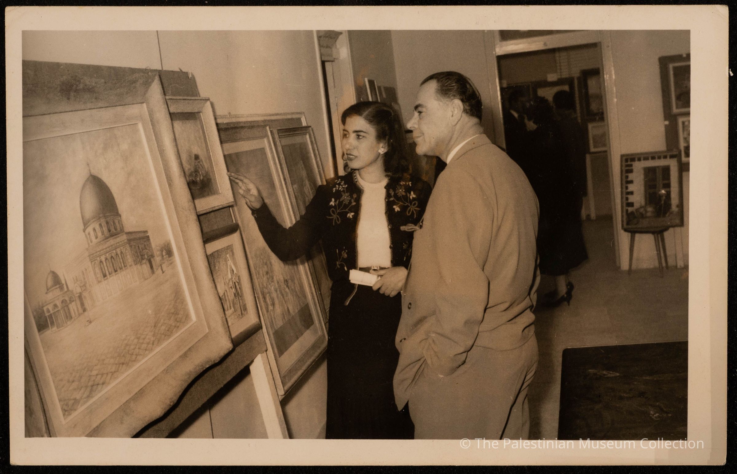 صورة الفنانة فاطمة المحب برفقة سعد جمعة رئيس الوزراء الأردني في أحد معارضه، التقطتها المصور ابو طلال ( ستوديو كولوميبا) في 16 كانون الاول 1960