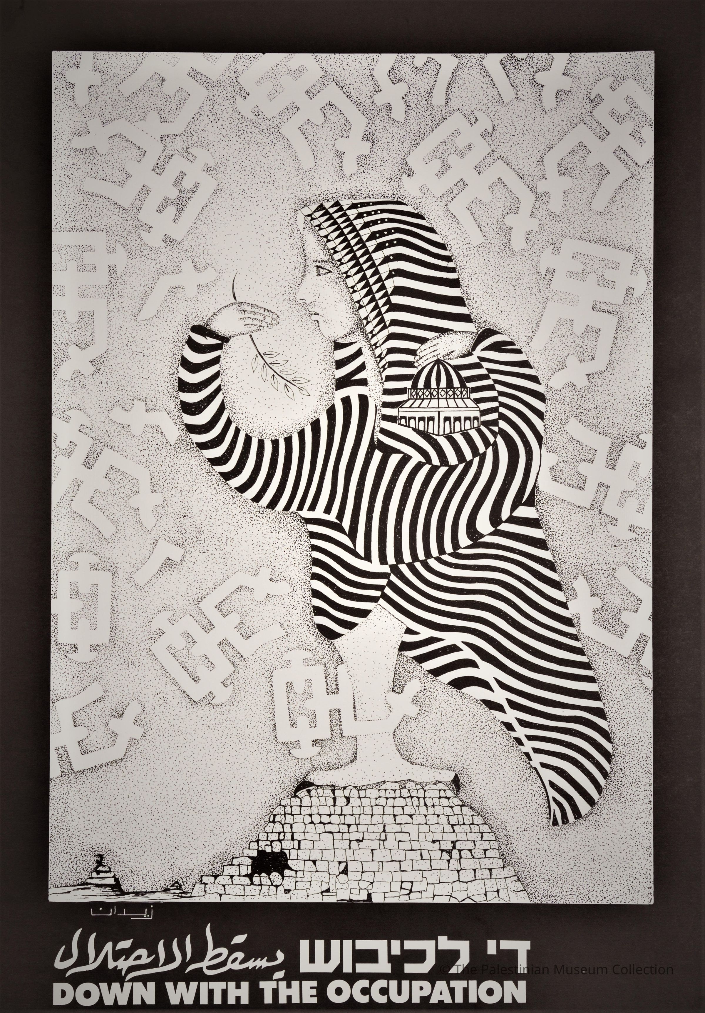 This poster by the artist Zeidan Nuiezi was part of the 'Down with the Occupation' exhibition held in 1987 by the Association of Artists for Freedom of Expression in the El-Hakawati Theatre in Jerusalem to mark 20 years since the 1967 occupation of the West Bank. The exhibition included posters by Palestinian and Israeli artists.Dimensions