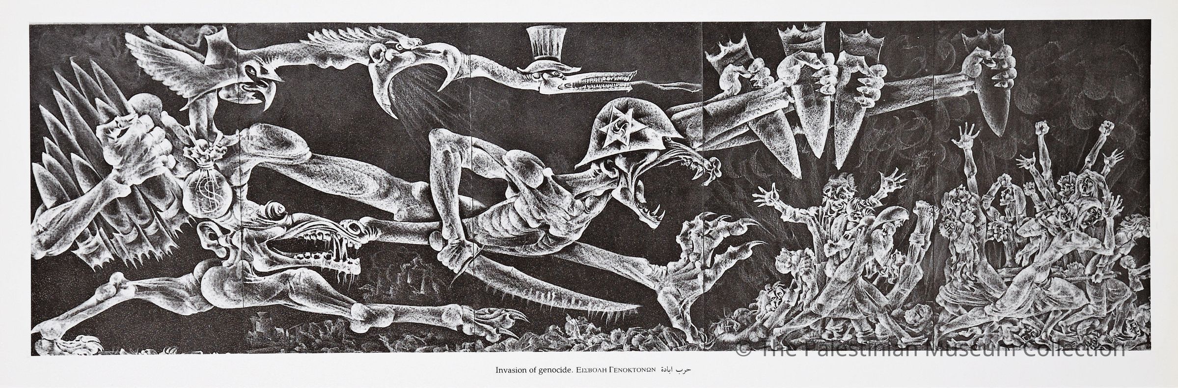 A black-and-white poster showing a painting of predatory animals and wild vultures; with the Dollar Sign and the Star of David drawn on them to represent Israel the USA, as they attack men, women, and children with knives and missiles.Dimensions