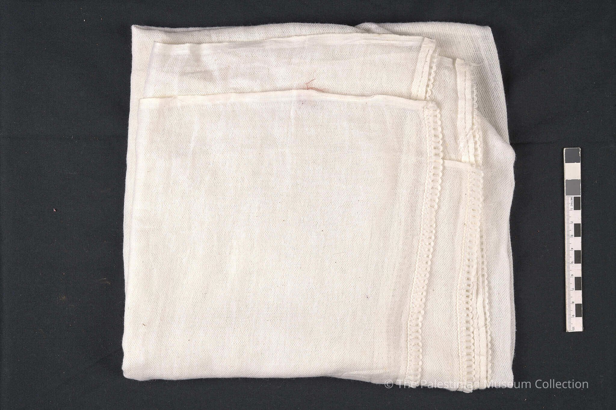 A white cotton shawl (cloth) from Bethlehem which would be worn on the head and is hand-stitched at all its edges.Made/Created