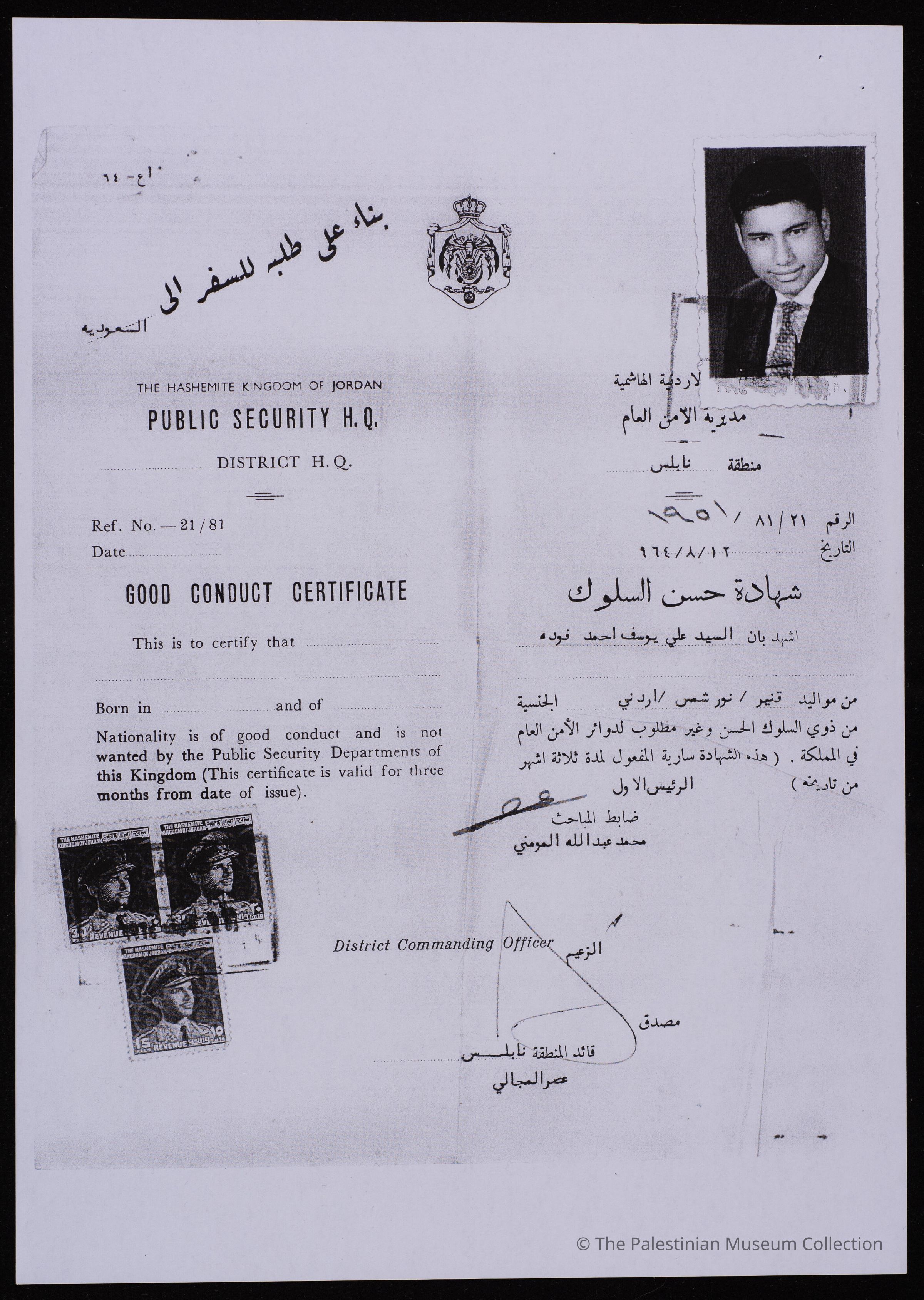 شهادة حسن سلوك للسيد علي فودة، تحتوي على معلوماته وصورة شخصية غير ملونة له. صادرة عن مديرية الامن العام في المملكة الاردنية الهاشمية بناءاً على طلب السيد علي فودة بغية السفر إلى السعودية.
