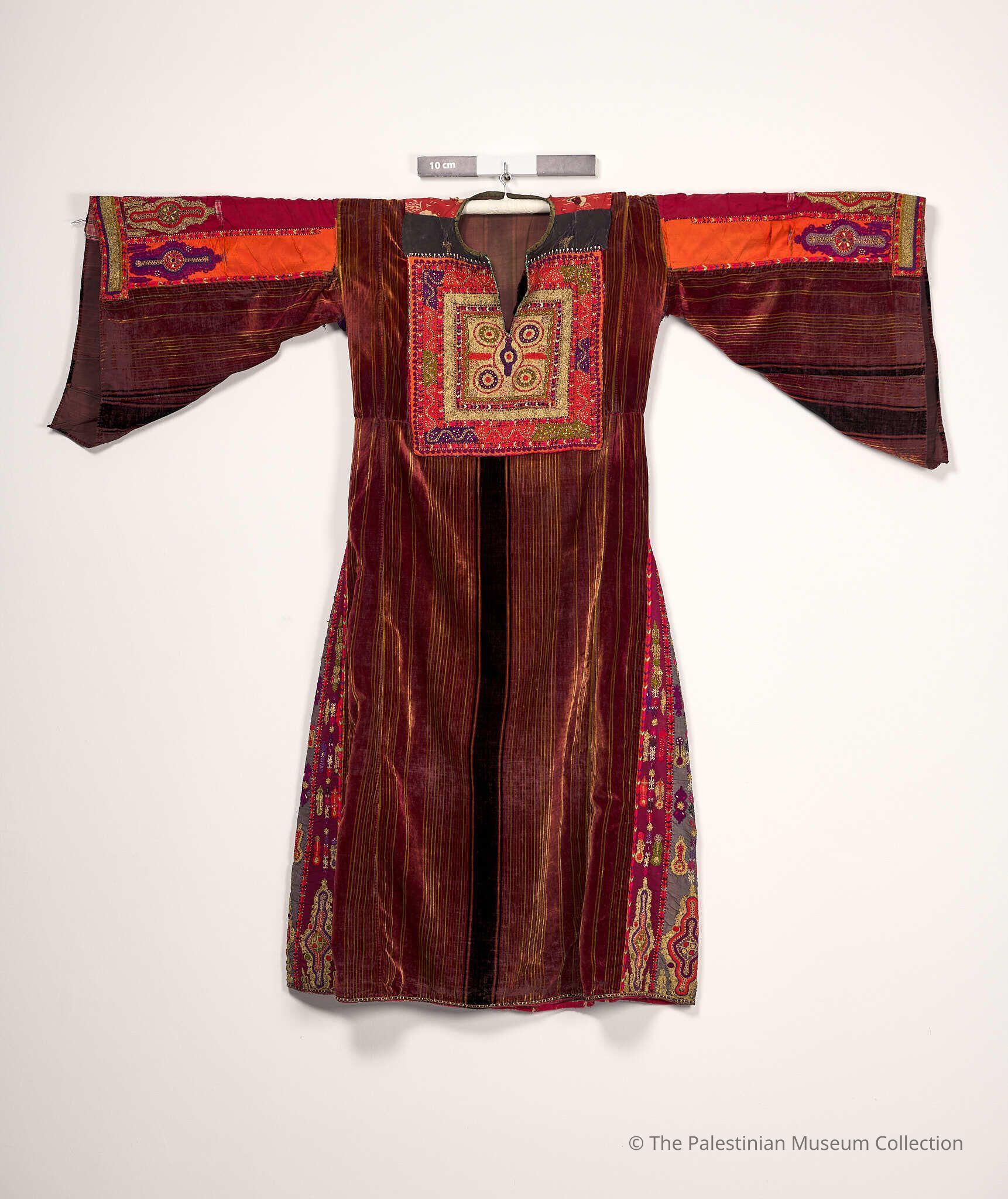 A Malak (King) thobe (dress) from the Bethlehem area, made of velvet fabric patterned in colours of maroon and black with tahriri stitches (couching) with gilded and silk threads in red, yellow, gold, purple, and green. The chest panel of the thobe was made of different fabrics before being placed on the thobe. It was embroidered with dense plant and geometric shapes in red, purple, green and gold, while the back of the panel was made of cotton fabric with etchings, as it was customary for a married woman to attach a piece of her husband's garments behind the chest panel (back neckline) of the thobe. The sleeves of the thobe are mradan (long triangular sleeves). Added to them are fabrics in the colours of orange and red. They are adorned with manajil (sickles) motifs and embroidered with a watch motif made with tahriri stitches in violet, red, and yellow. The chest and back panels of the thobe do not bear any tatreez (embroidery), but the sides (al-Banayiq) were made of a different fabric and then placed on the thobe. They were also embroidered with geometric shapes and watch and (manajil) sickles stitch patterns. The back/tail area of the thobe (al-Dhiyal) is decorated with the watch stitch pattern and is surrounded by a rectangle of tatreez.Made/Created