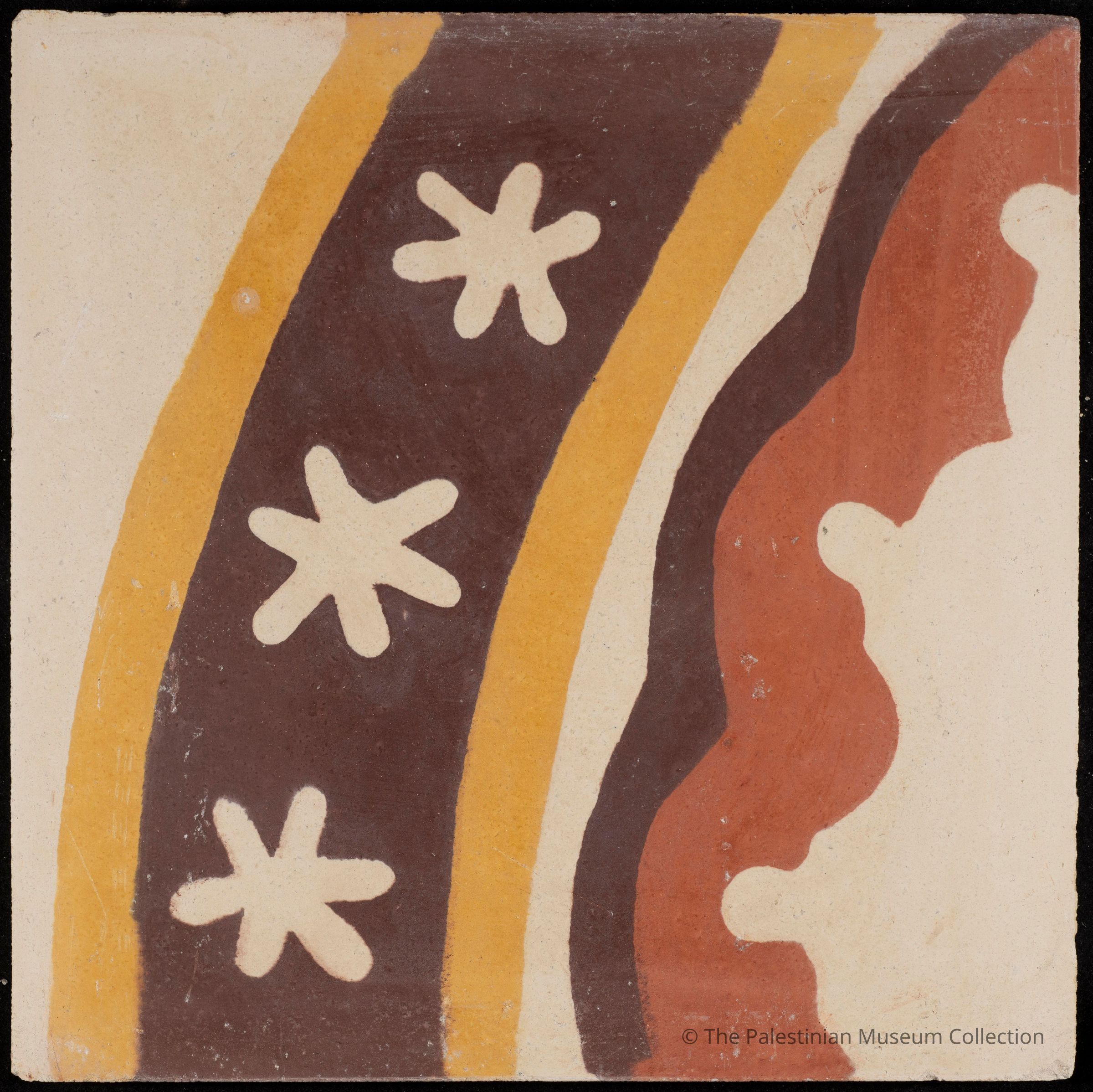 A 20 × 20 cm coloured cement tile featuring the "Round Zunnar (Border)" design. This tile is a contemporary reproduction, cast using an original mold from the Aslan Tile Factory in Nablus.Made/Created