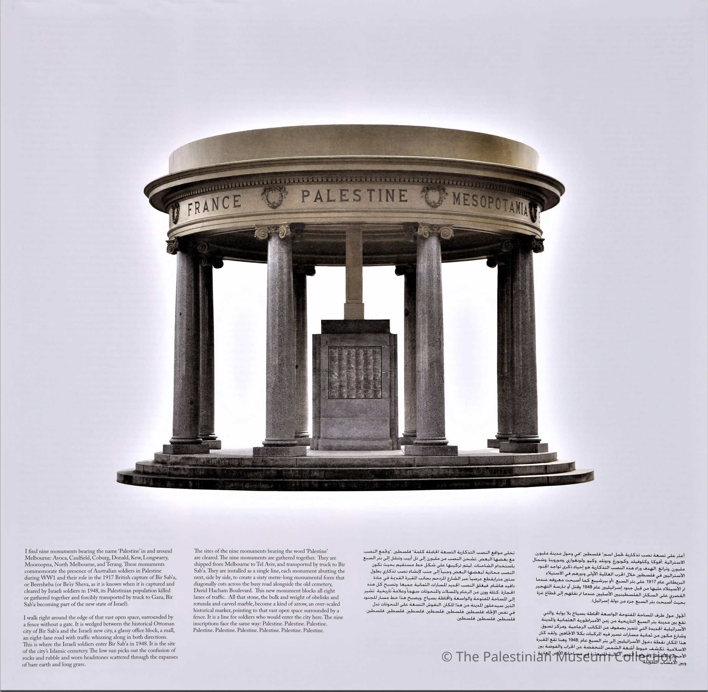 ملصق ملون، عبارة عن نصب تذكاري في أستراليا لإحياء ذكرى القتلى من الجنود الأستراليين في فلسطين في الحرب العالمية الاولى 1914- 1918، ودورهم في مساعدة الجيش البريطاني على الاستيلاء على منطقة بئر السبع عام 1917. هذا الملصق جزء من عمل فني بعنوان "نصب مقارنة (فلسطين 2012)" للفنان توم نيكلسون