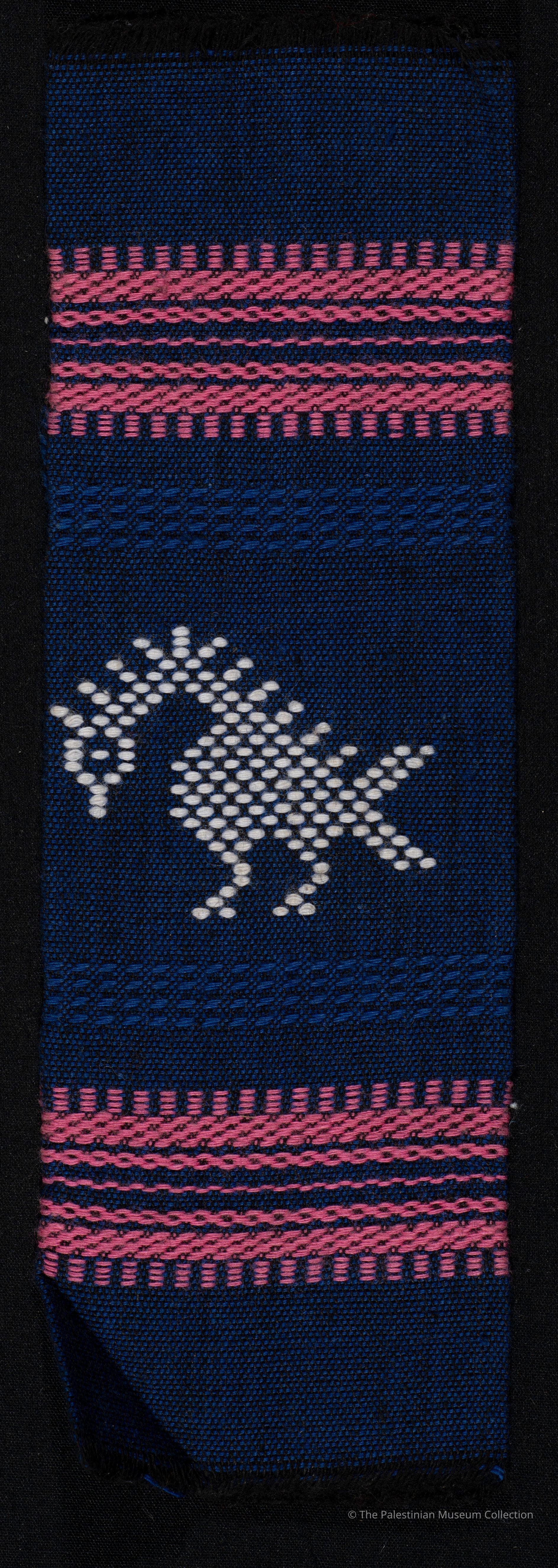 منديل سفرة من قماش الكتان باللون الكحلي، مربع الشكل، ومُطرّز بقطبة الصليب الفلاحية بخيوط حرير باللون الزهري والأزرق والأبيض بخطوط أُفقية وشكل ديناصور