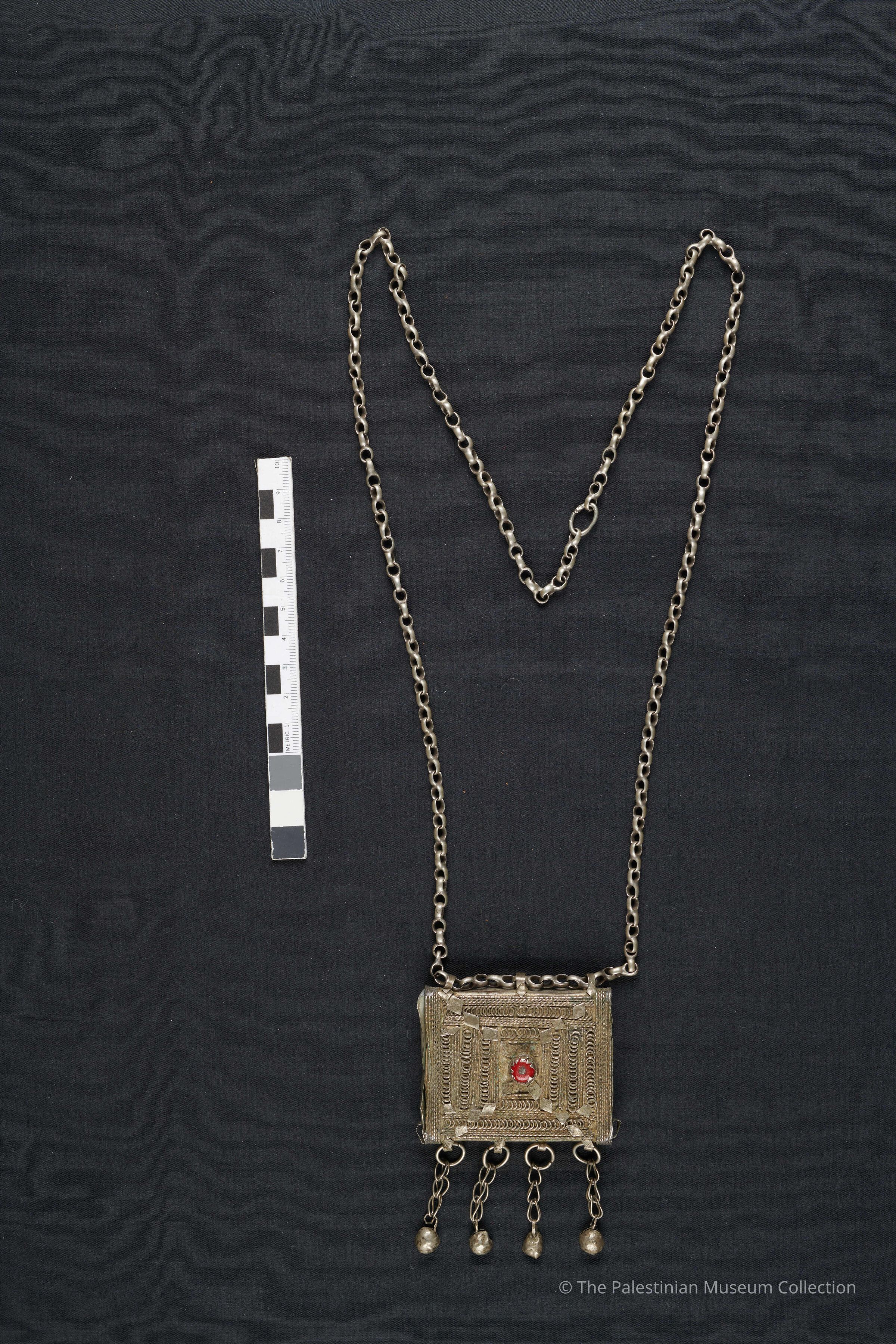 A hijab necklace comprised of a thick chain and carrying a decorated rectangular amulet handcrafted of silver, in the middle of which is placed a red coral stone, hanging from which are four small spheres. Inside the amulet would be placed a piece of paper typically inscribed with prayers or Quranic versesMade/Created
