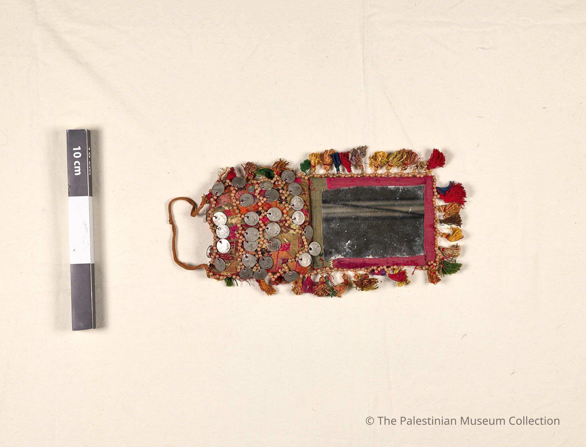A bride’s mirror holder and kohl (eyeliner) maker made of cotton and cloth. It is embroidered with geometric and plant shapes in red, black, and orange silk threads. It has an opening at the top in which the kohl bottle is placed, and from its lower part hangs the mirror wrapped in a piece of cloth and decorated with coloured lace and beads. It is decorated with pieces of Ottoman currency.