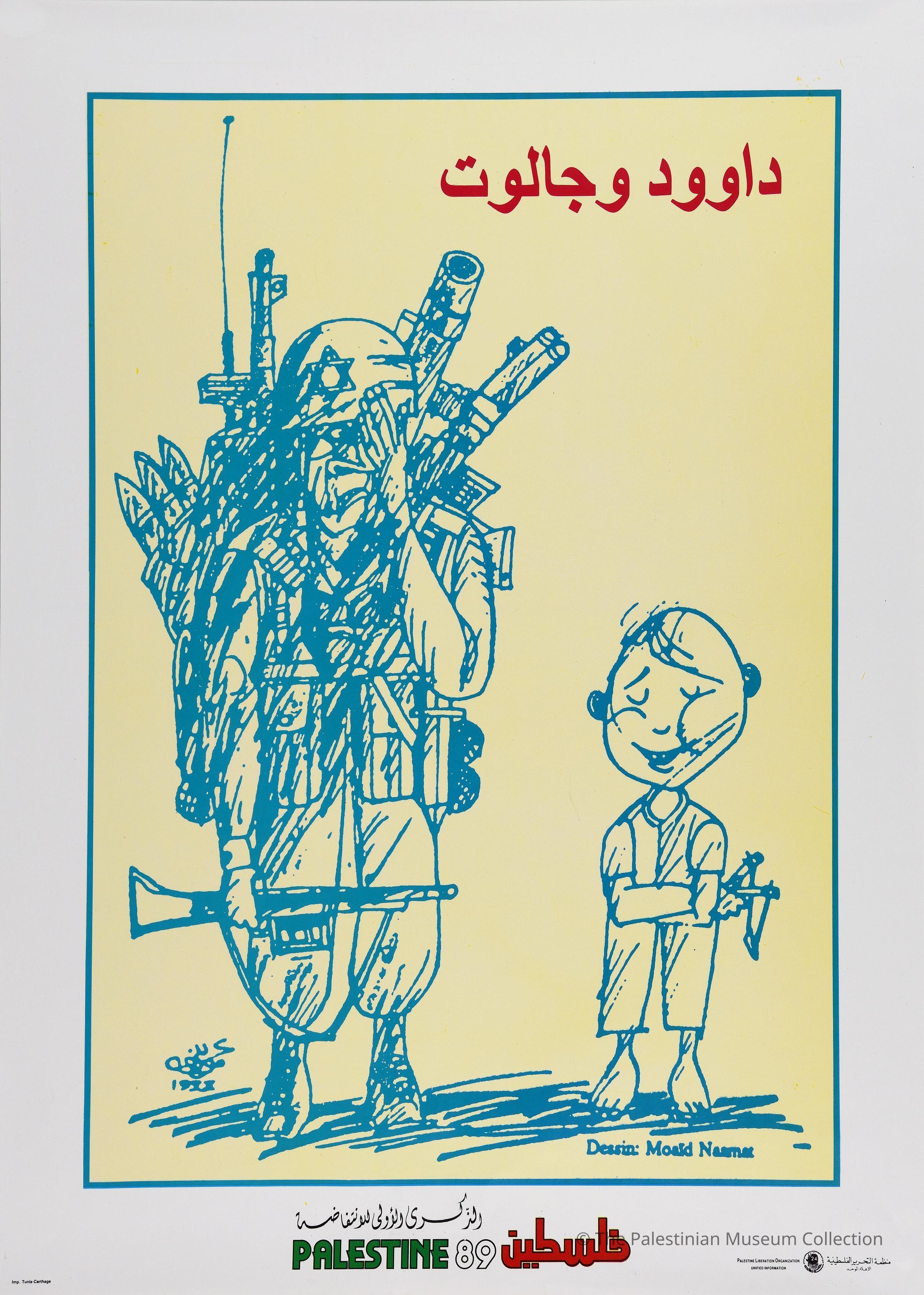 A colour poster showing an Israeli soldier with plenty of rifles as he looks in fear at a young child with a slingshot in his hand.
