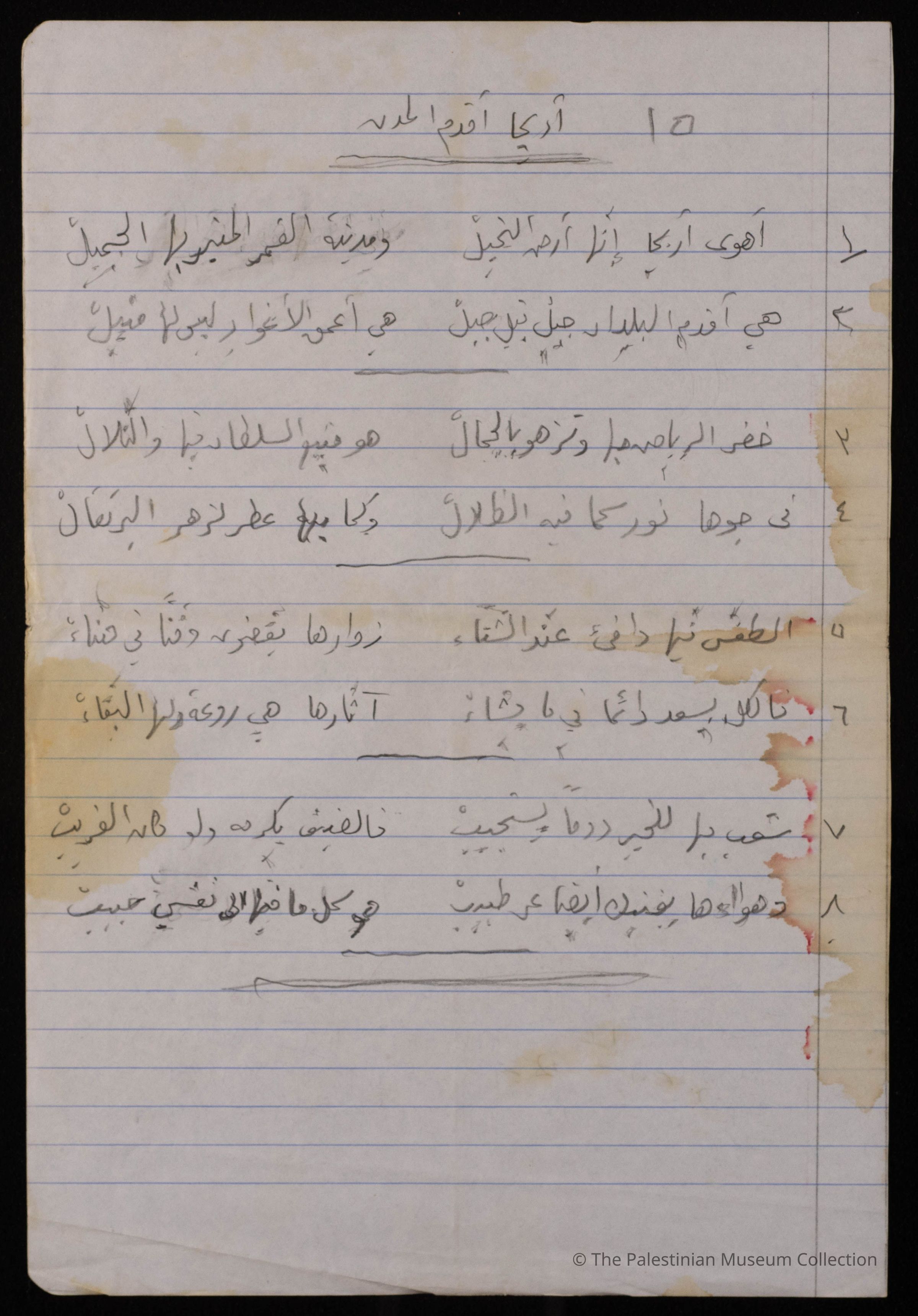 مخطوطة قصيدة باللغة العربية بعنوان" اريحا اقدم المدن" للشاعرة فاطمة المحب، ولا تحمل القصيدة اية اشارة الى تاريخ كتابتها.
