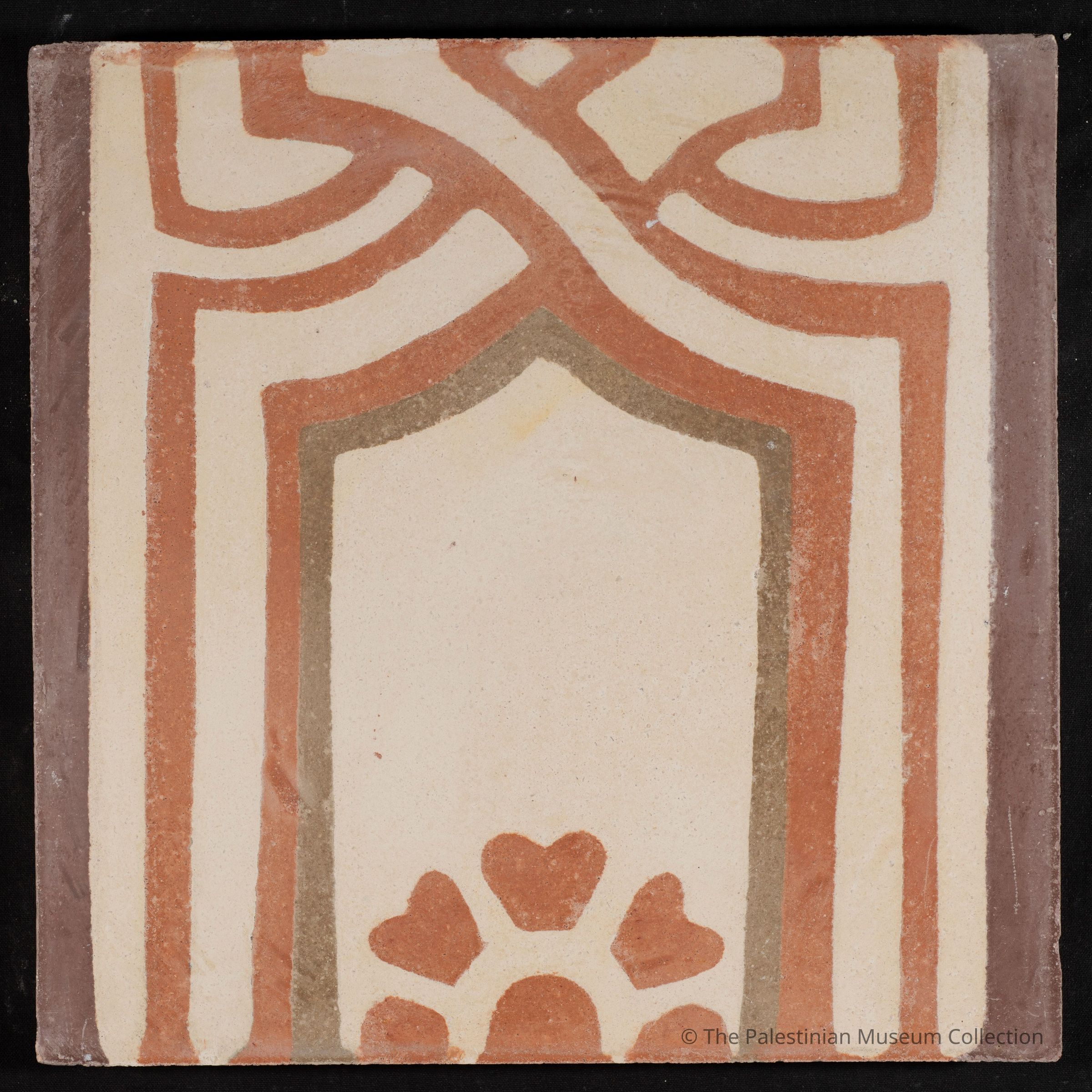 بلاطة زنار إسمنتيّة ملوّنة بحجم 20 × 20 سم. وهي نموذج حديث سُكبت في قالب يمتلكه مصنع أصلان للبلاط في نابلس يعود إلى نهاية القرن التاسع عشر.