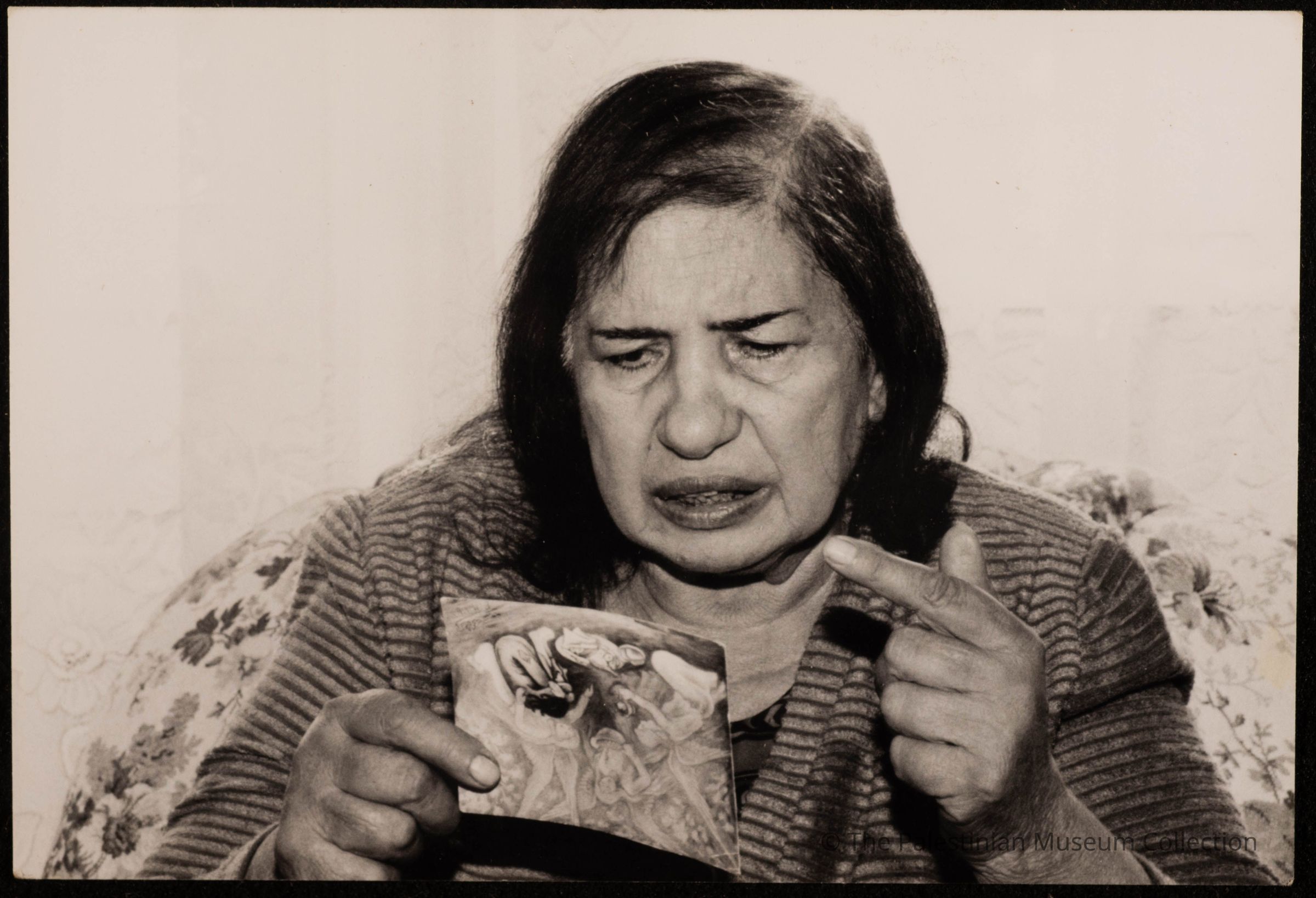 صورة الفنانة فاطمة المحب وهي تحمل صورة عن لوحة الميلاد التي رسمتها