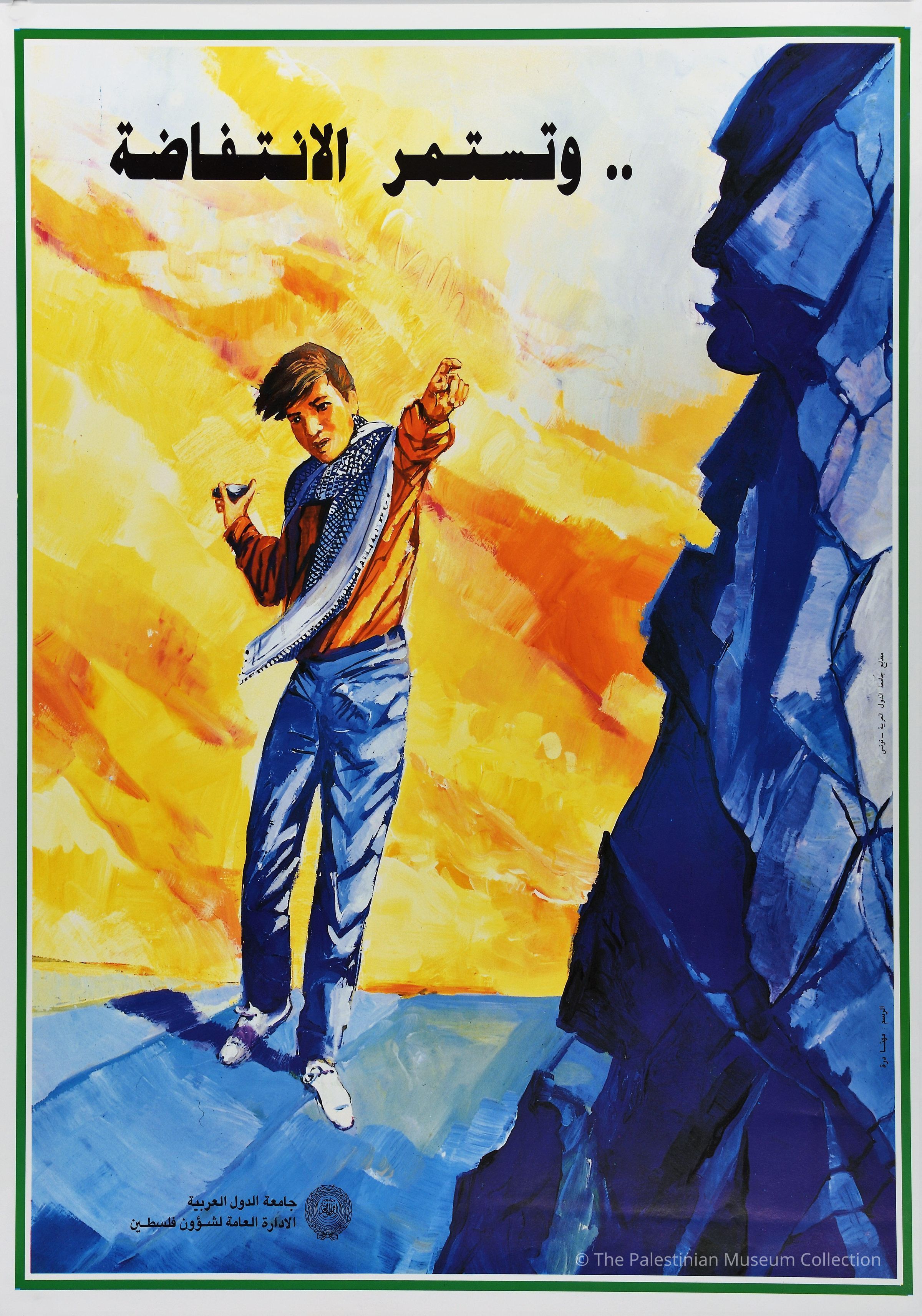 A colour poster showing a drawing of a boy wearing a Kufiya around his neck as he aims with his finger to throw a stone with his other hand.Dimensions