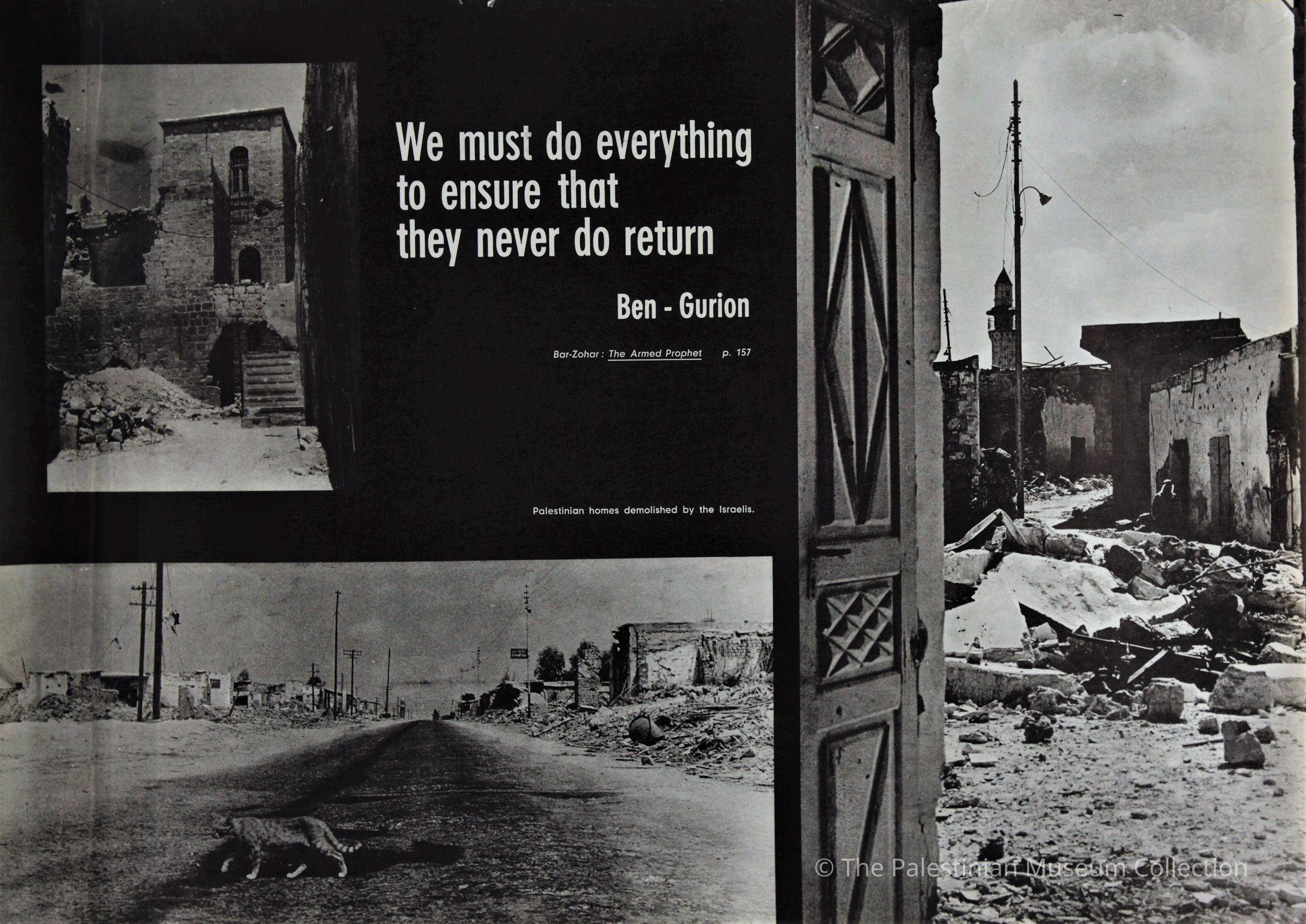 A monochromatic poster showing photos of the Palestinians houses that were levelled to the ground by the Israeli Occupation Army.Dimensions
