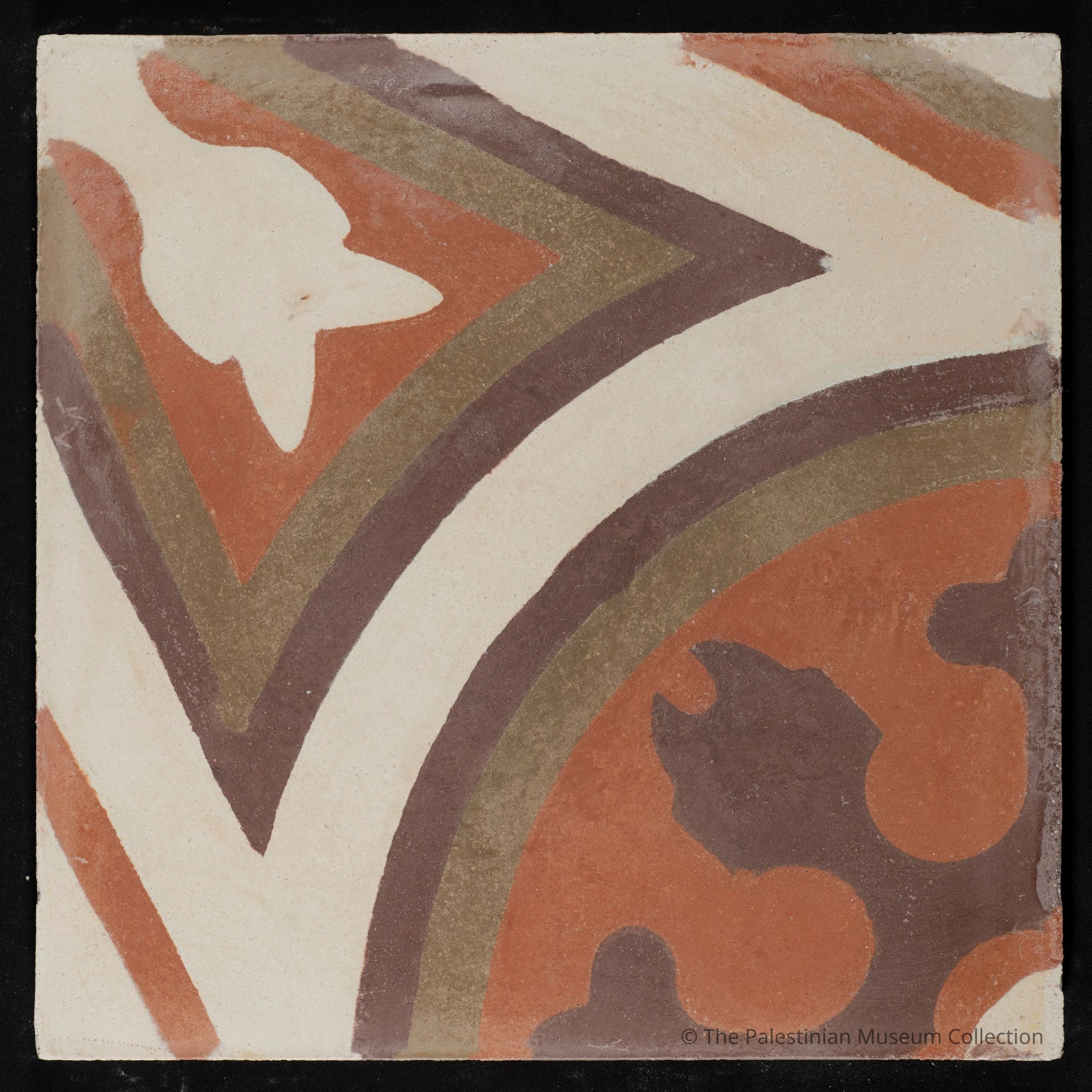بلاطة إسمنتيّة ملوّنة بحجم 20 × 20 سم، تحمل تصميم "سجّادة البيروتية"، وهي نموذج حديث سُكبت في قالب يمتلكه مصنع أصلان للبلاط في نابلس.