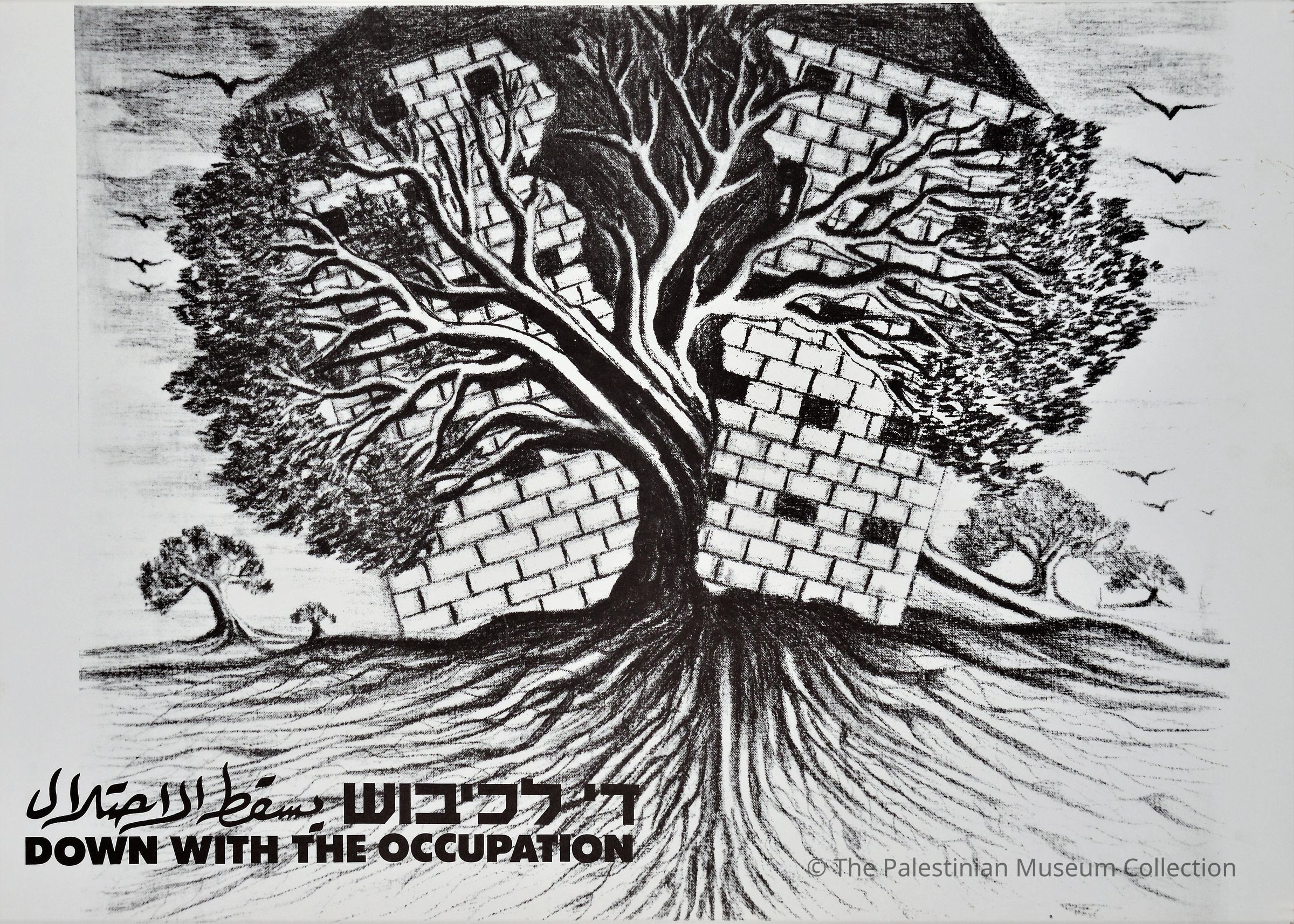 This poster by the artist Hatem Ghanem was part of the 'Down with the Occupation' exhibition held in 1987 by the Association of Artists for Freedom of Expression in the El-Hakawati Theatre in Jerusalem to mark 20 years since the 1967 occupation of the West Bank. The exhibition included posters by Palestinian and Israeli artists.Dimensions