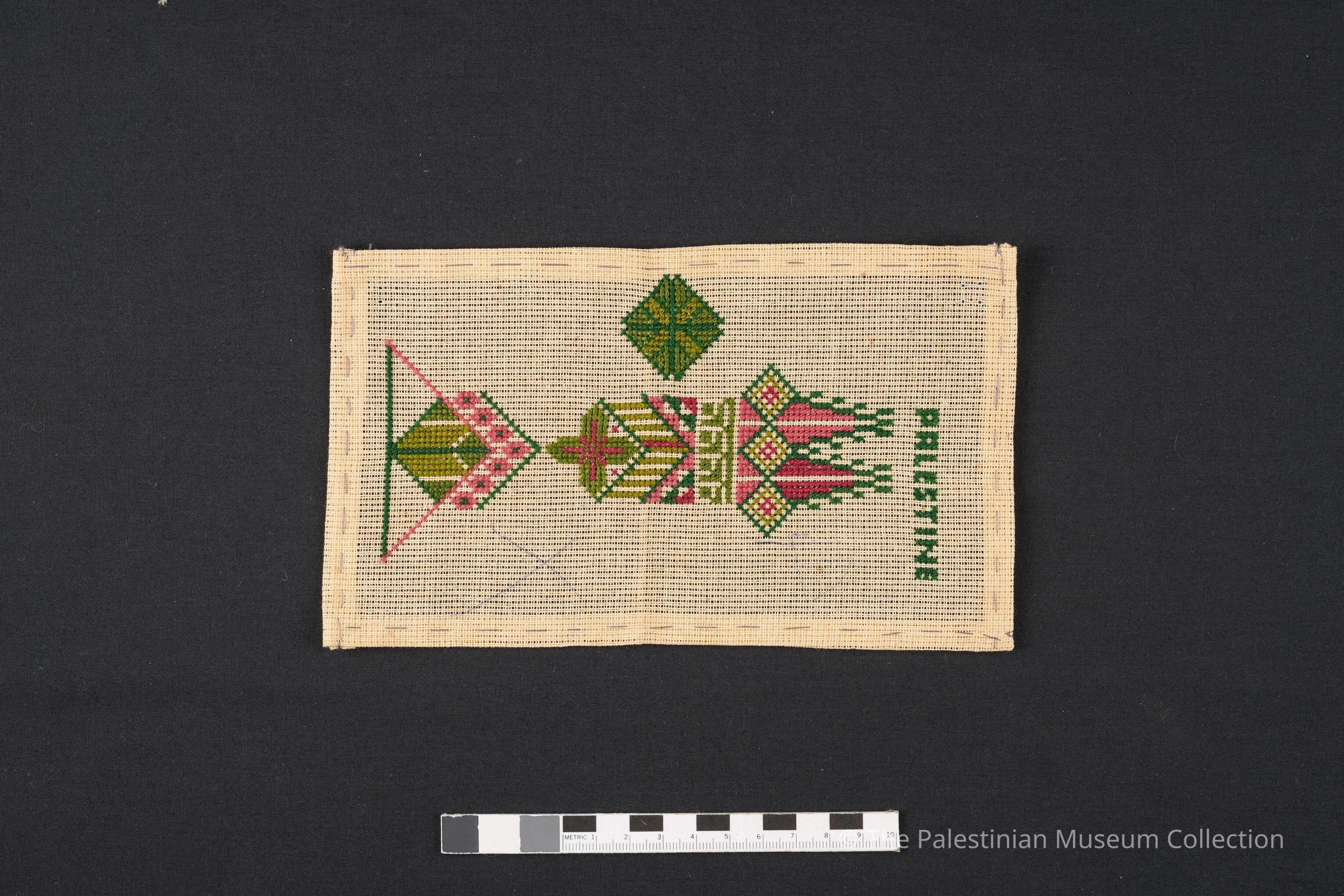 نموذج تطريز على قماش ايتامين مطرز بحرير اخضر فاتح واخضر غامق وزهري فاتح وزهري غامق مكتوب عليه كلمة palestine ورسمة السروات