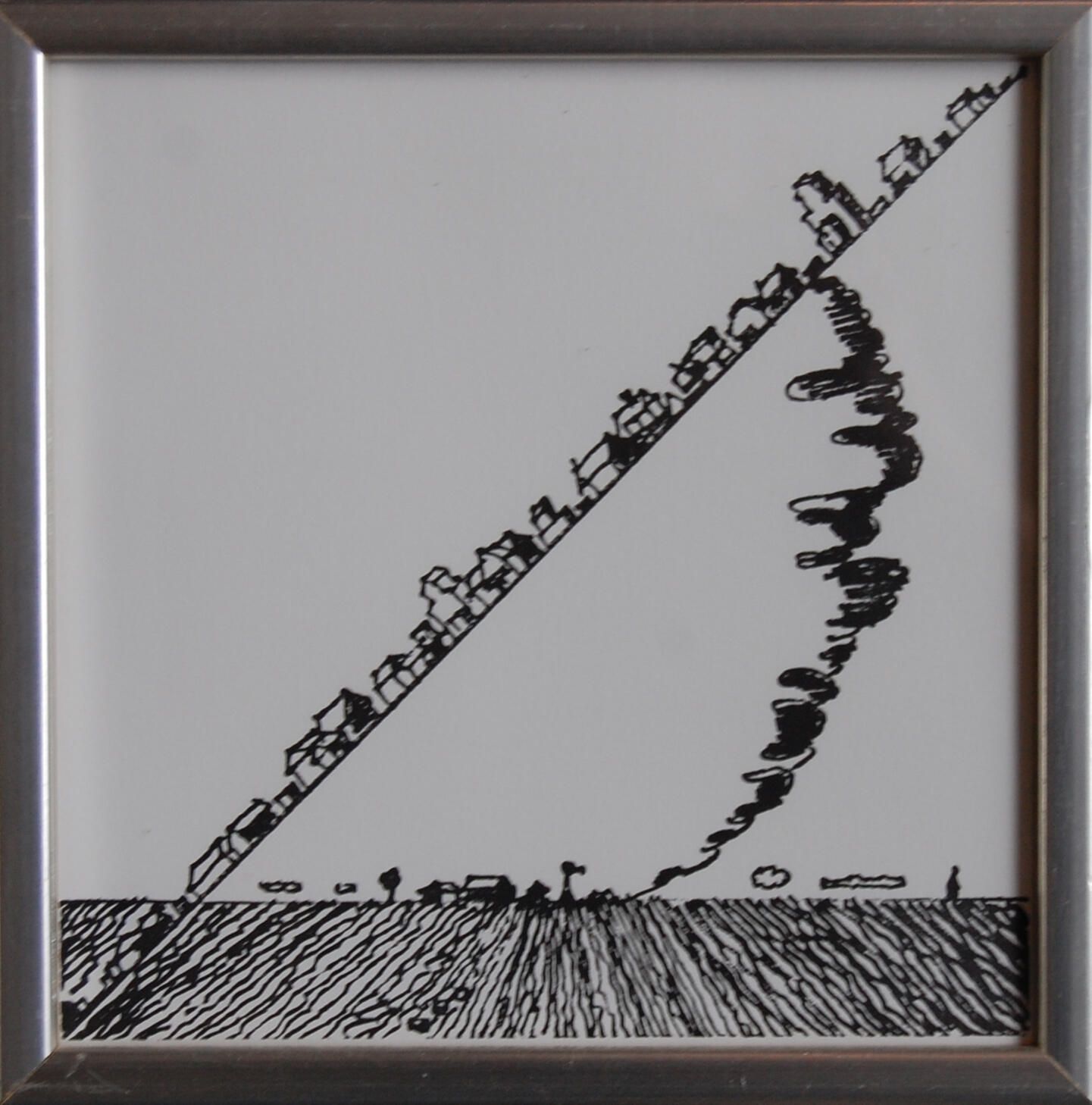In black and white, the artist depicted a rural landscape with a field of waving lines in the foreground and farm buildings in the background on the horizon. Stretching across the sky (starting in the lower left corner and reaching the upper right one) the artist added a second "horizon" line that is completely covered with buildings. The angular line is held in place with a swirling cyclone that reaches from the ground three-quarters up the angular line.Artwork Details