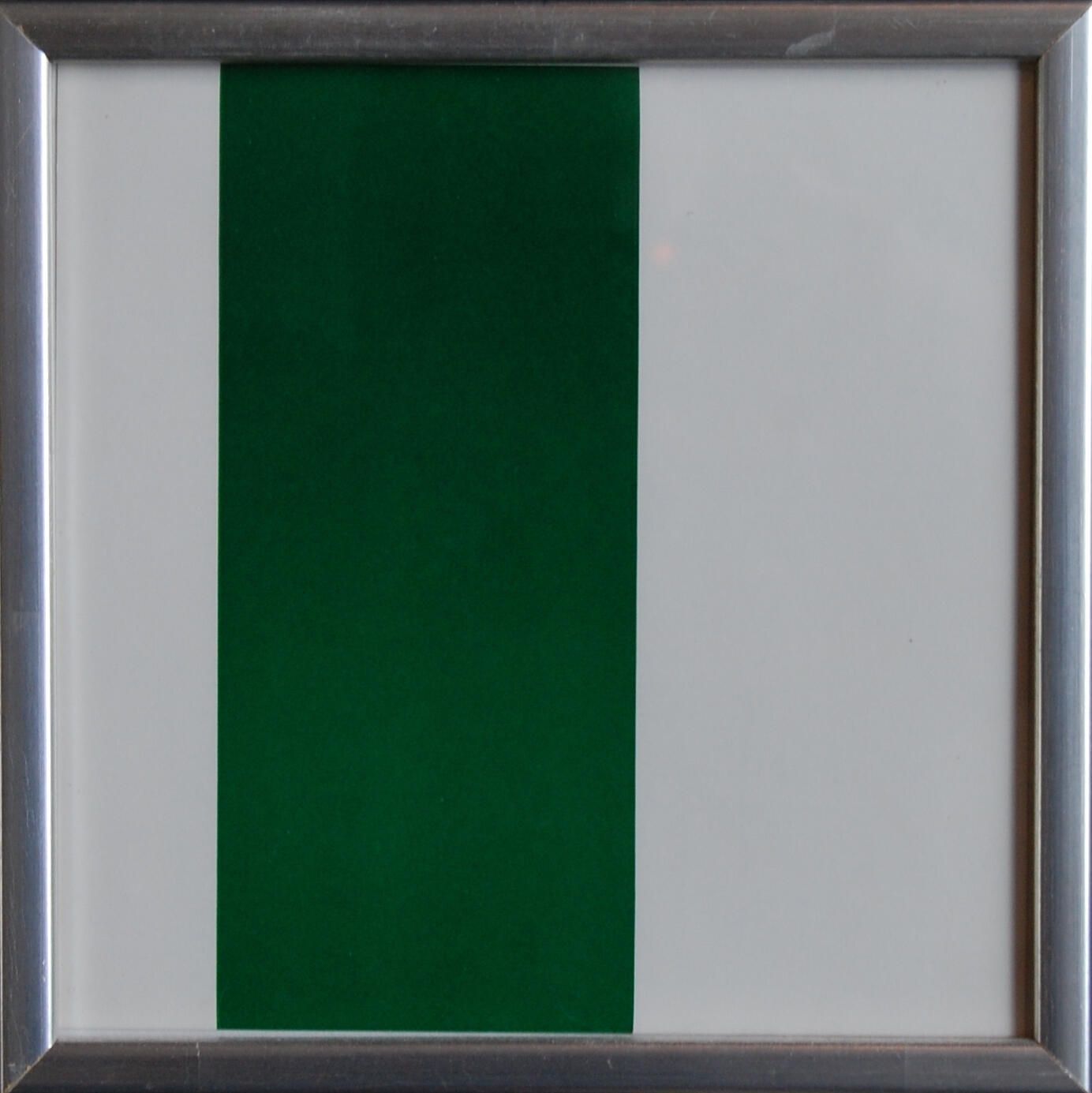 Each image is composed of three stripes. The one on the far left is about one-third the width of the other two. The print in this portfolio is green and white with the green stripe in the center. There are a total 250 prints in each in four color combinations.Artwork Details